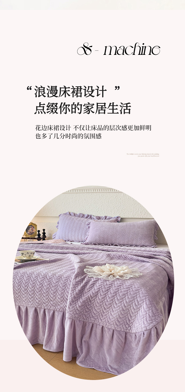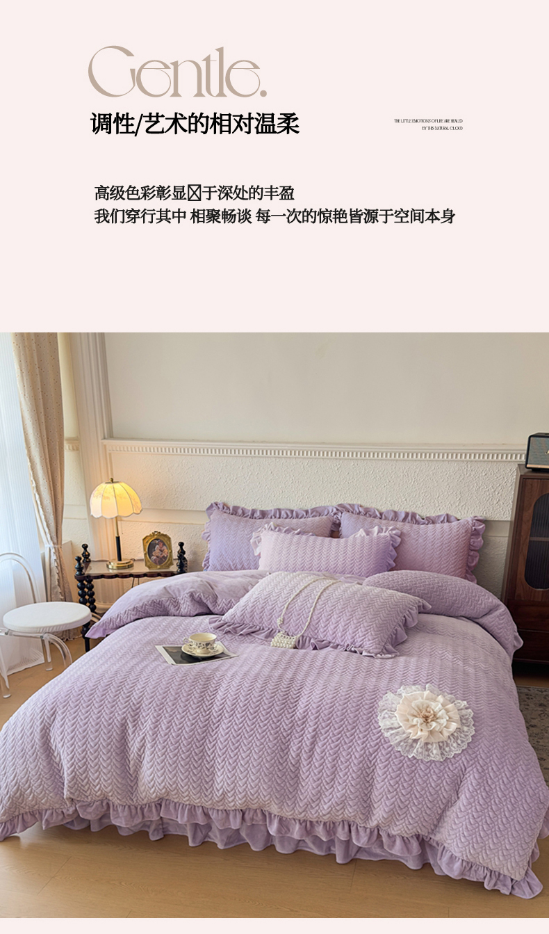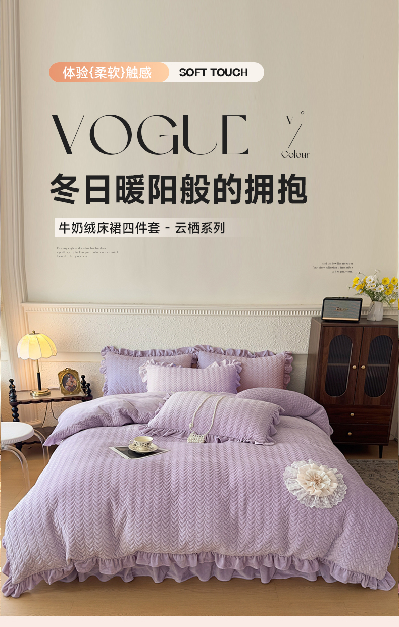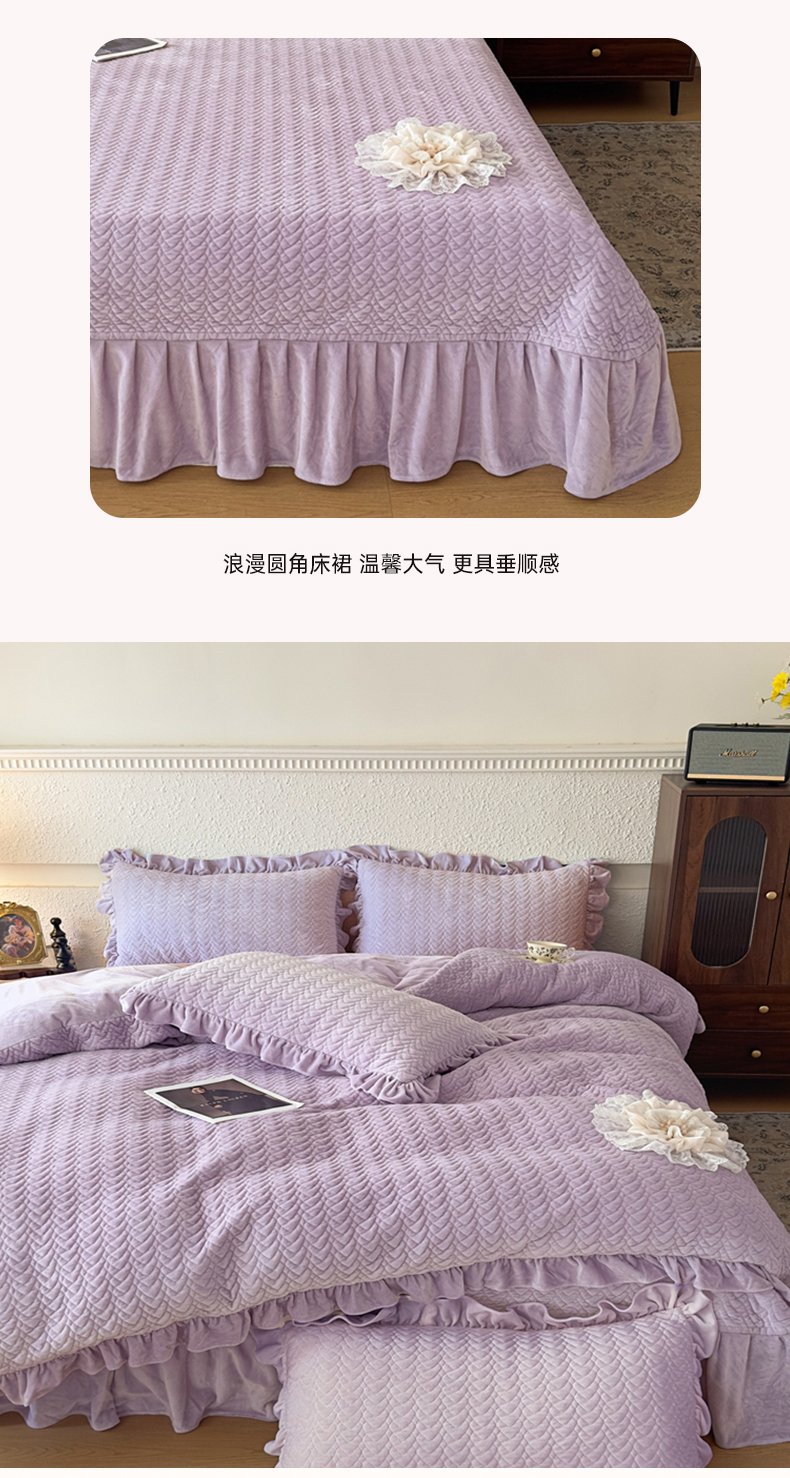 商品名称:乐嘉盈2025年新款纯色刺绣床裙款牛奶绒四件套-云栖 云栖-紫