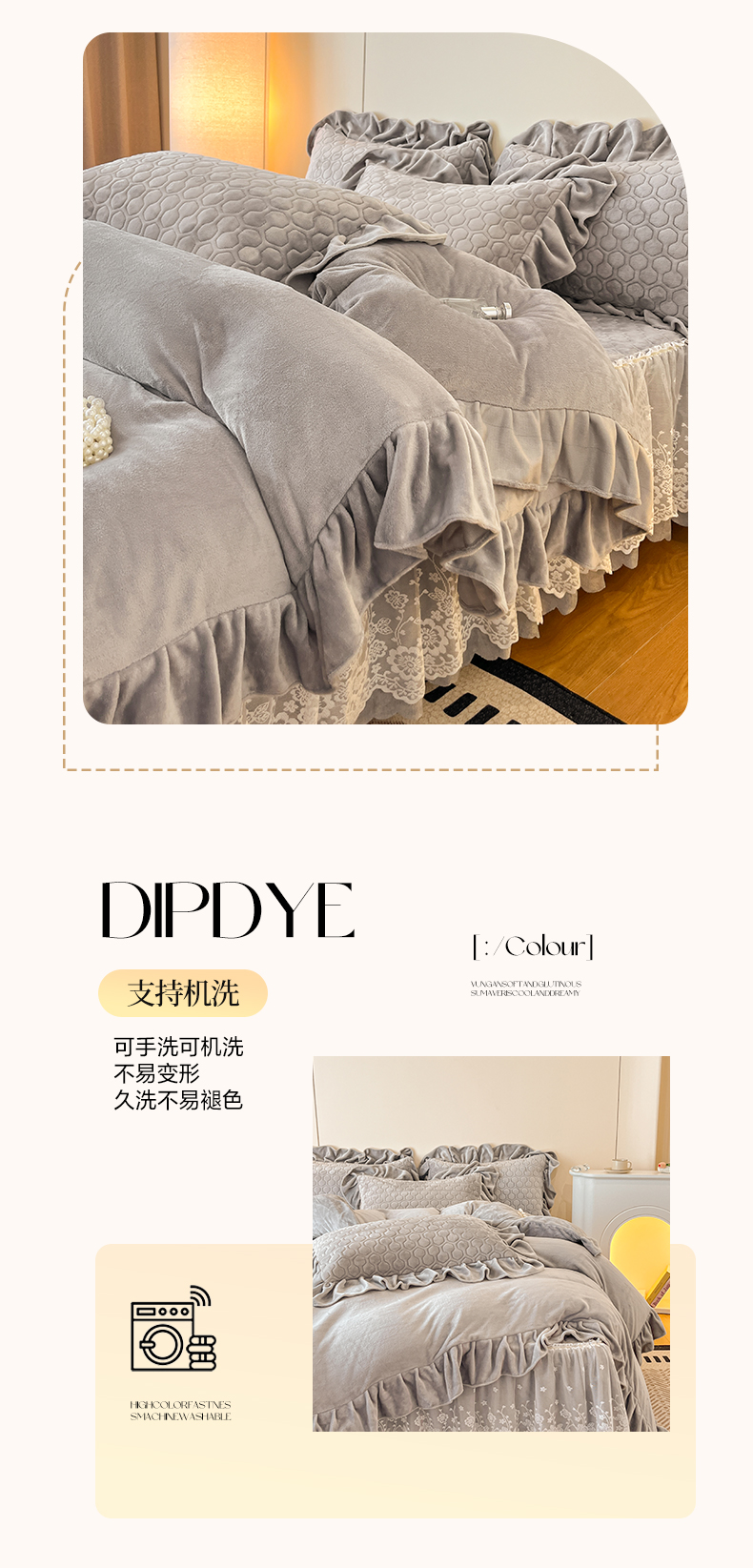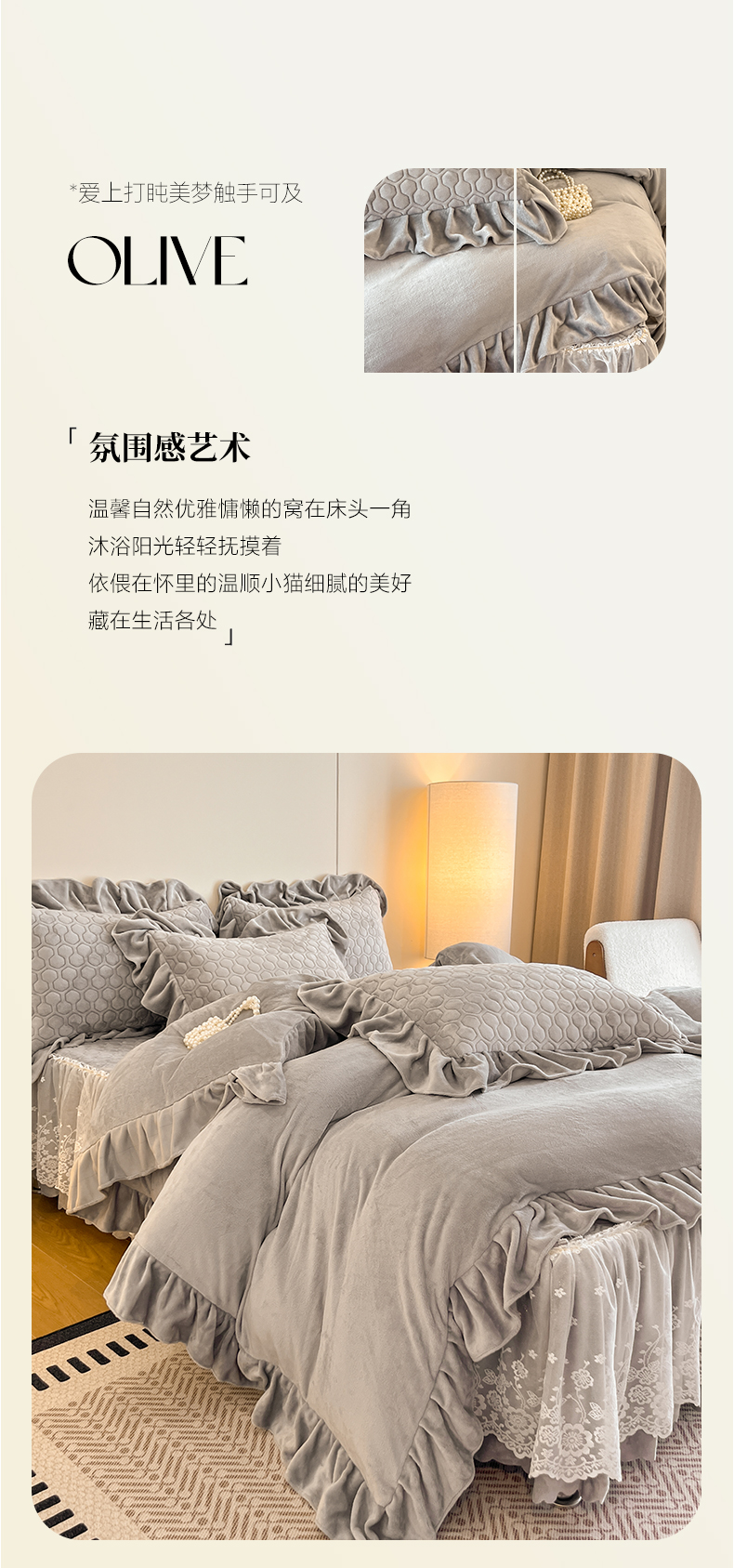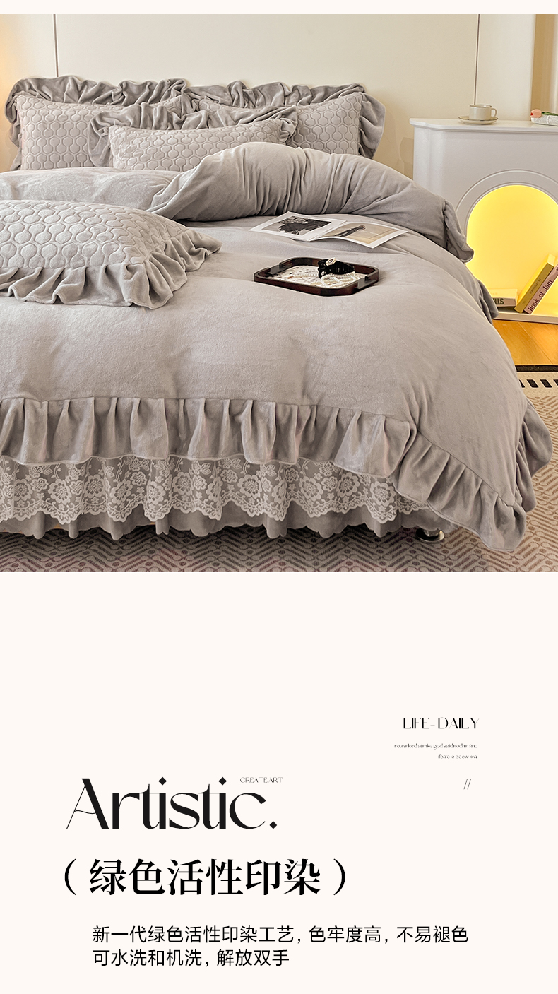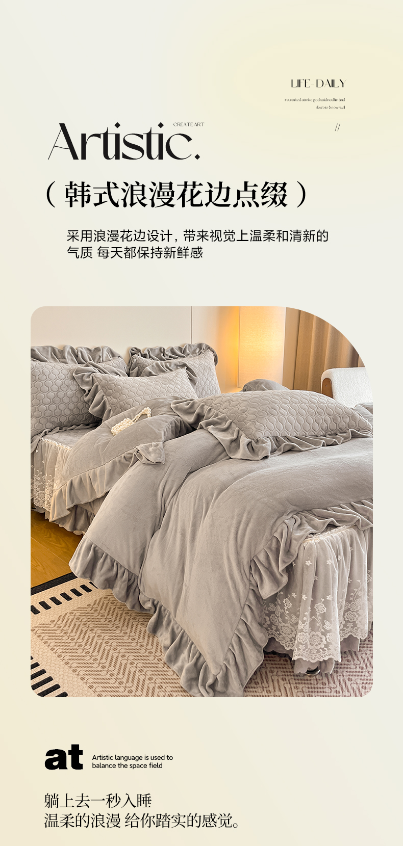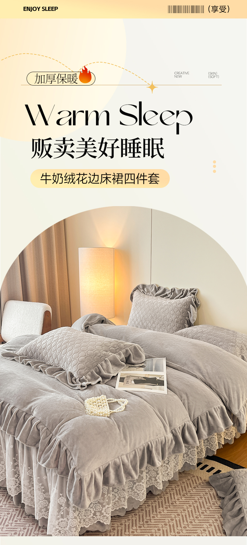 当前位置: 91家纺网 > 商品网购 > 床品套件 > 四件套 > 牛奶绒四件套 > 民新家纺 2025新款牛奶绒花边床裙四件套 浪漫时光-灰