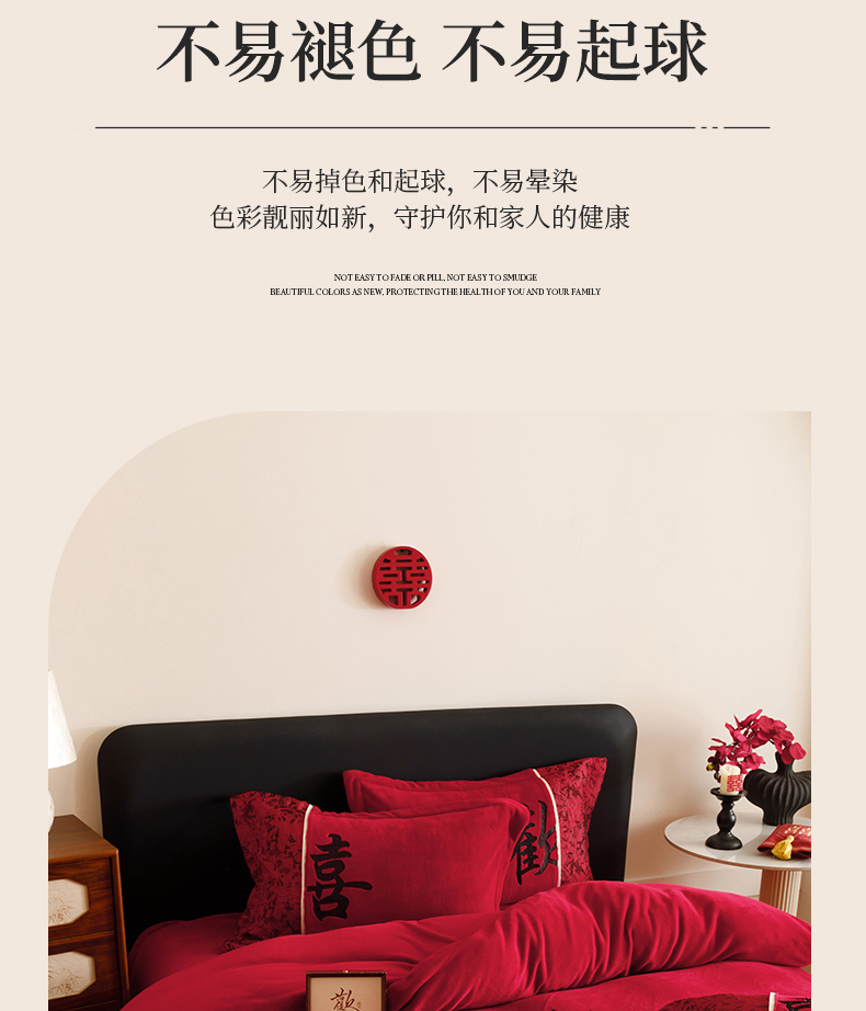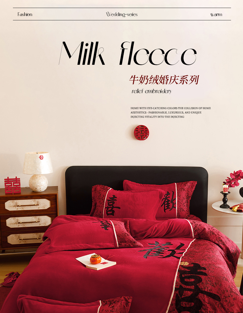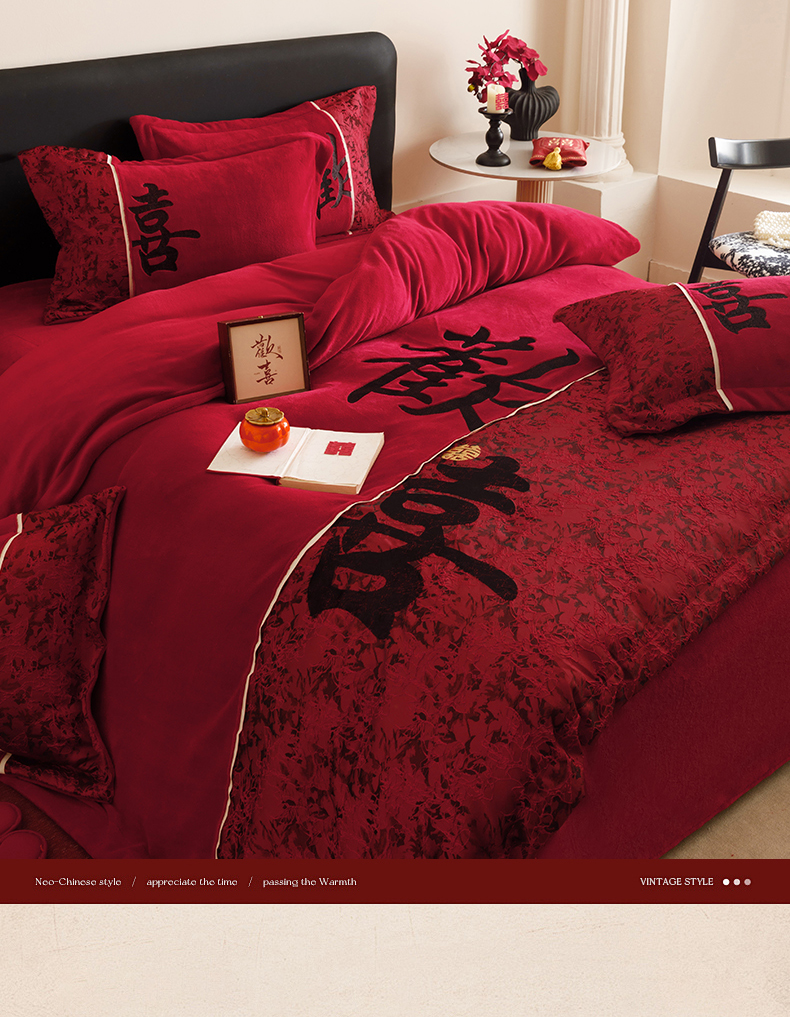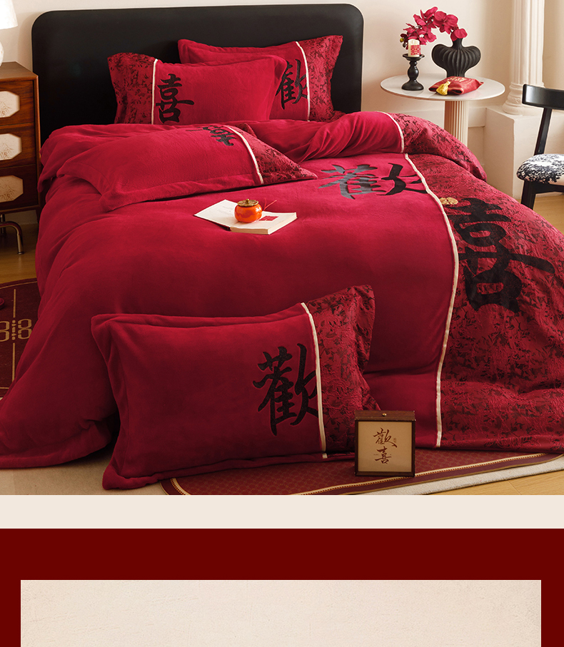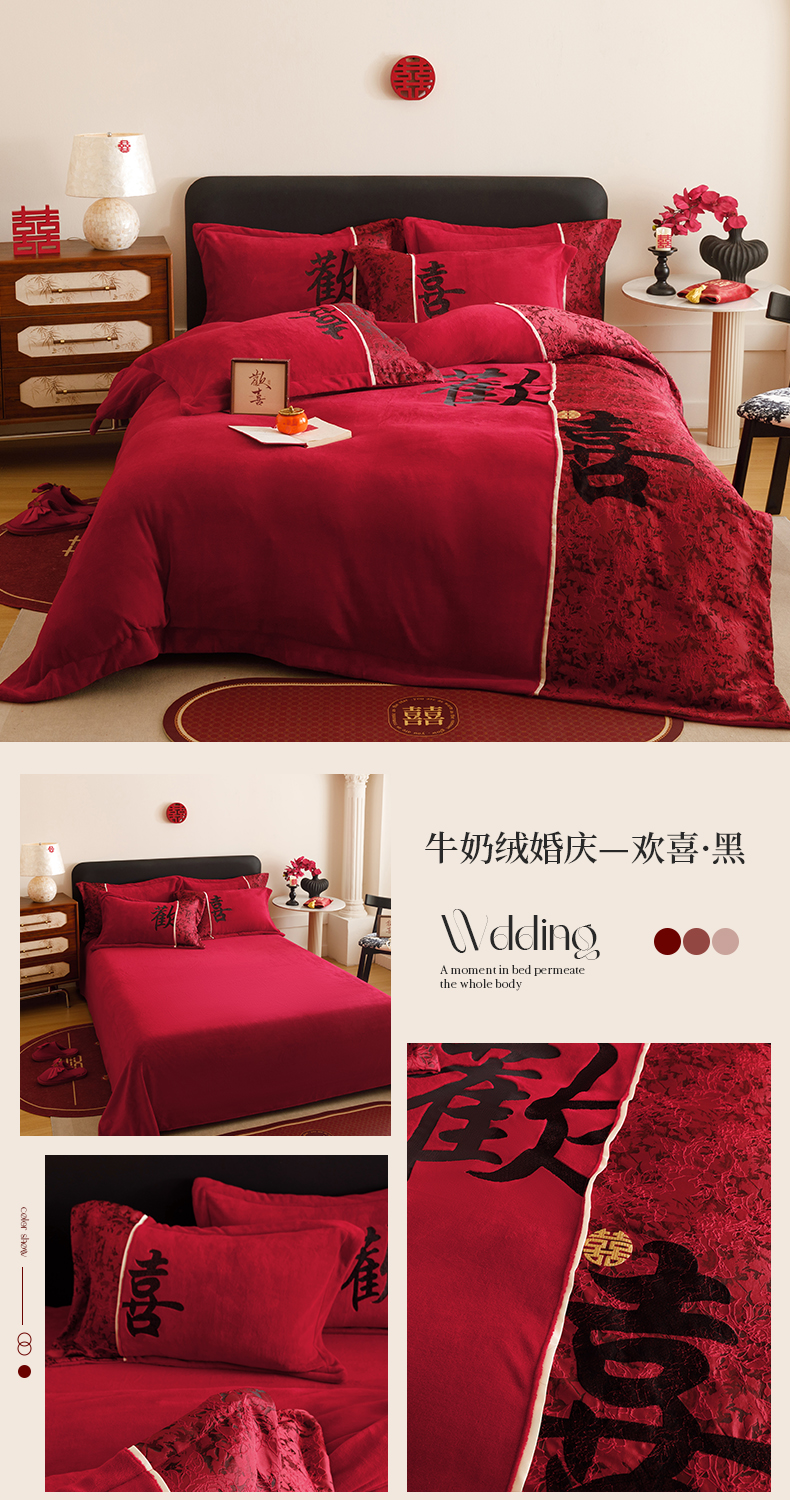 商品名称:苏源家居 2025新款牛奶绒加厚新款婚庆喜庆刺绣大红四件套 绒 欢喜-黑色