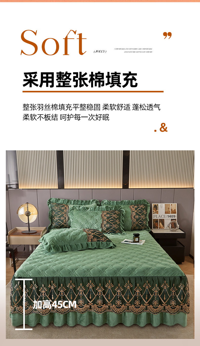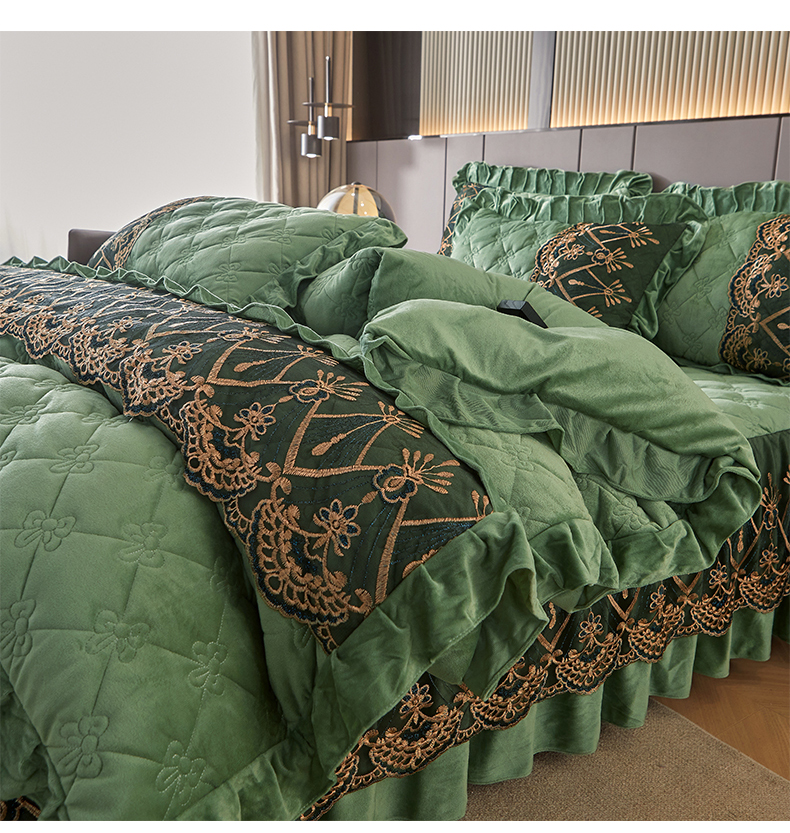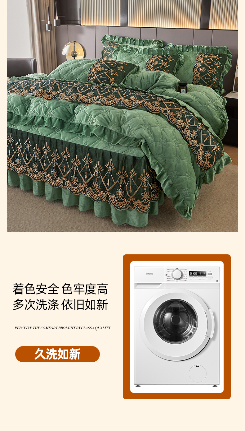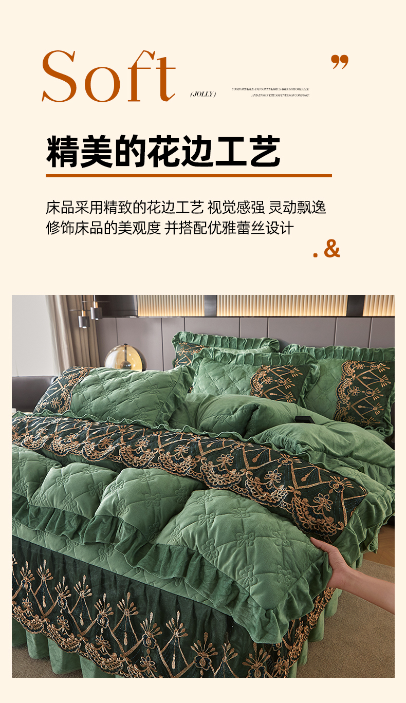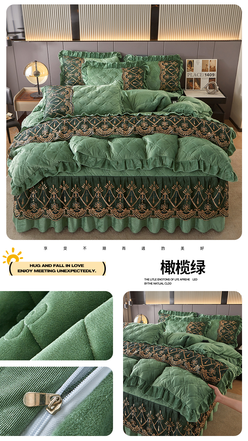 当前位置: 91家纺网 > 商品网购 > 床品套件 > 四件套 > 水晶绒四件套 > 屹成家纺2025新款水晶绒夹棉绗缝床裙四件套(塞纳河畔)四件套起售价不低于230元 橄榄绿