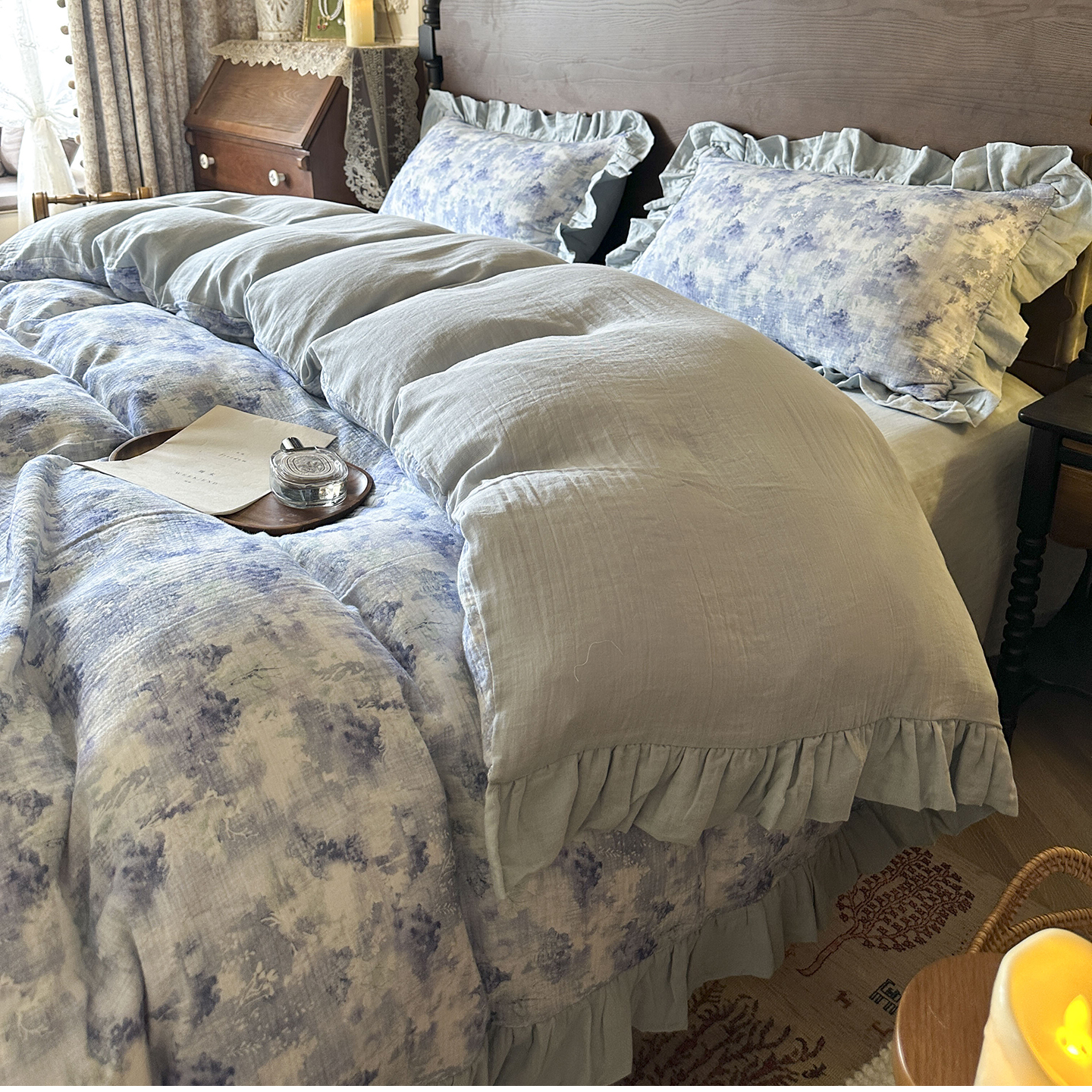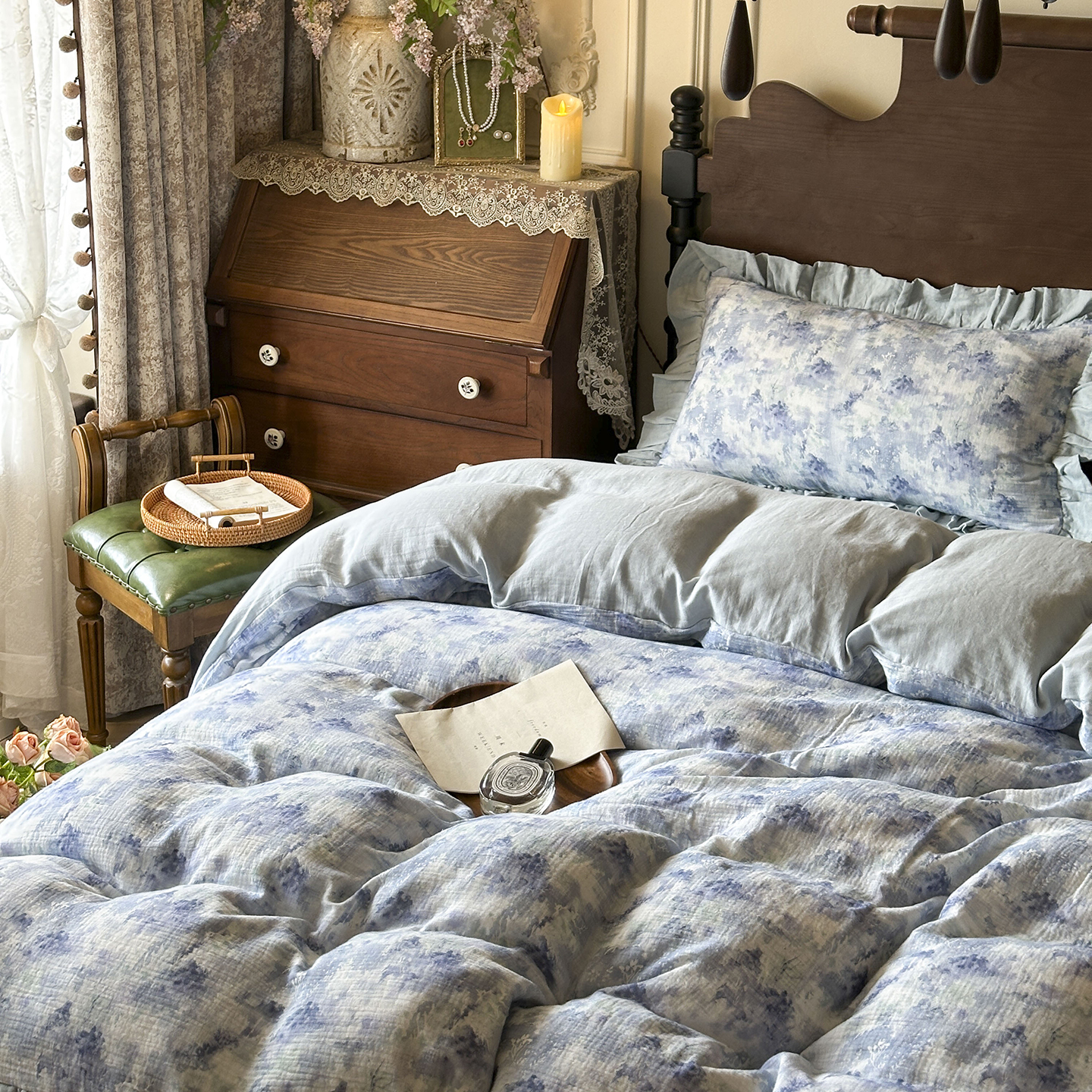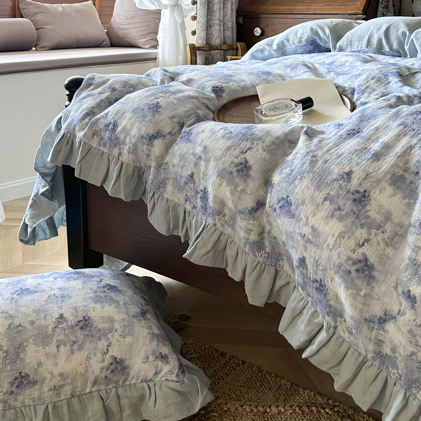 (总)多乐娜 2025新款法式纯棉双层纱皱皱纱花边款新疆长绒棉双层纱绉纱数码印花四件套-暮雨烟场景二【(会员-20)控价298/318起(券后!!)务必控价谢谢配合】