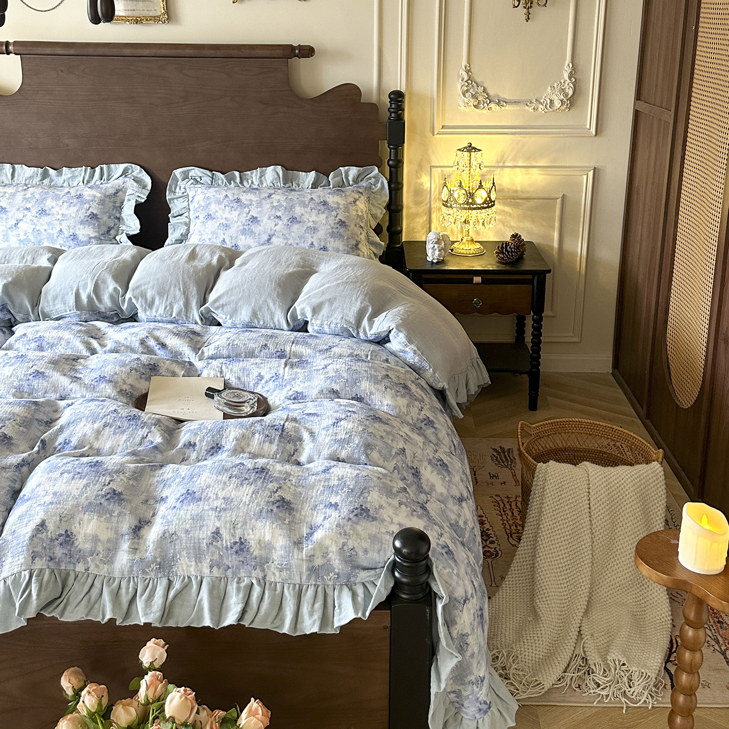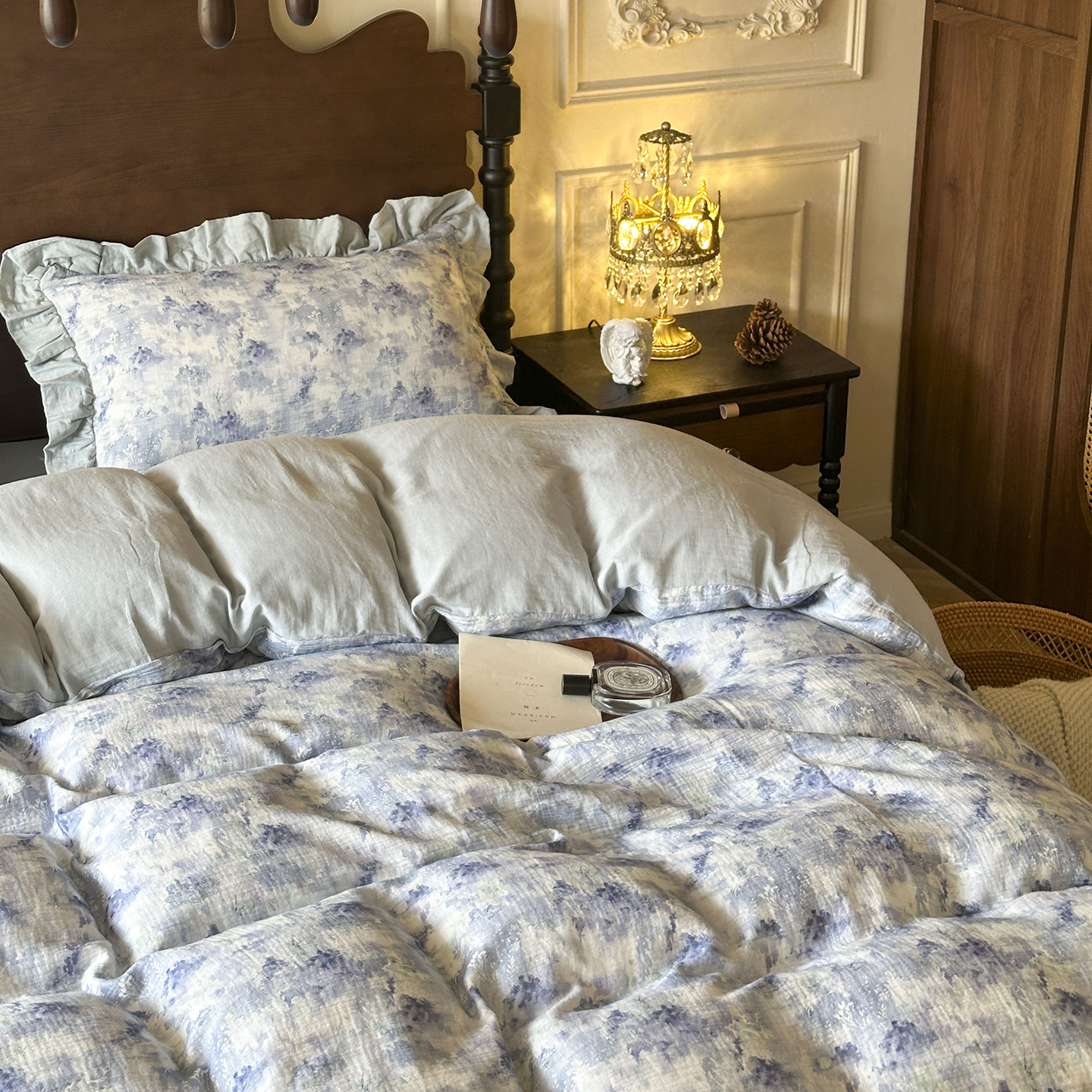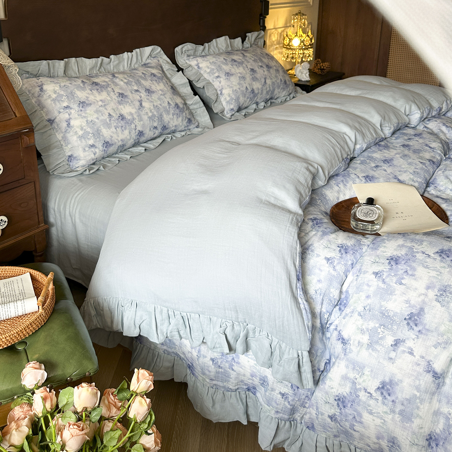 (总)多乐娜 2025新款法式纯棉双层纱皱皱纱花边款新疆长绒棉双层纱绉纱数码印花四件套-暮雨烟场景二【(会员-20)控价298/318起(券后!!)务必控价谢谢配合】