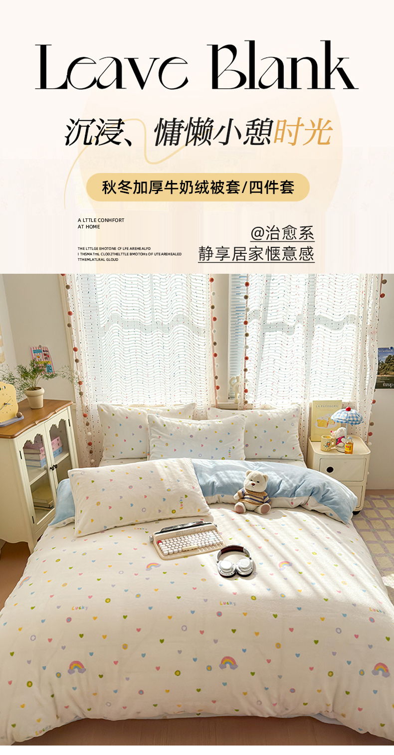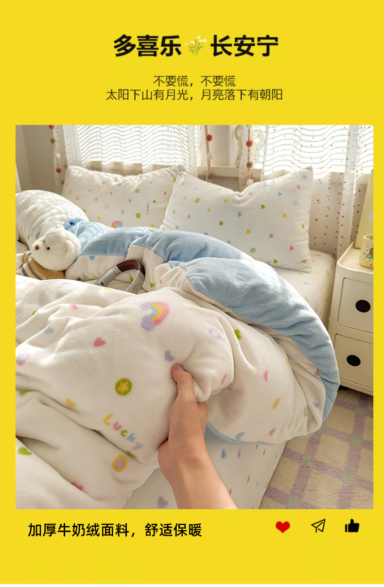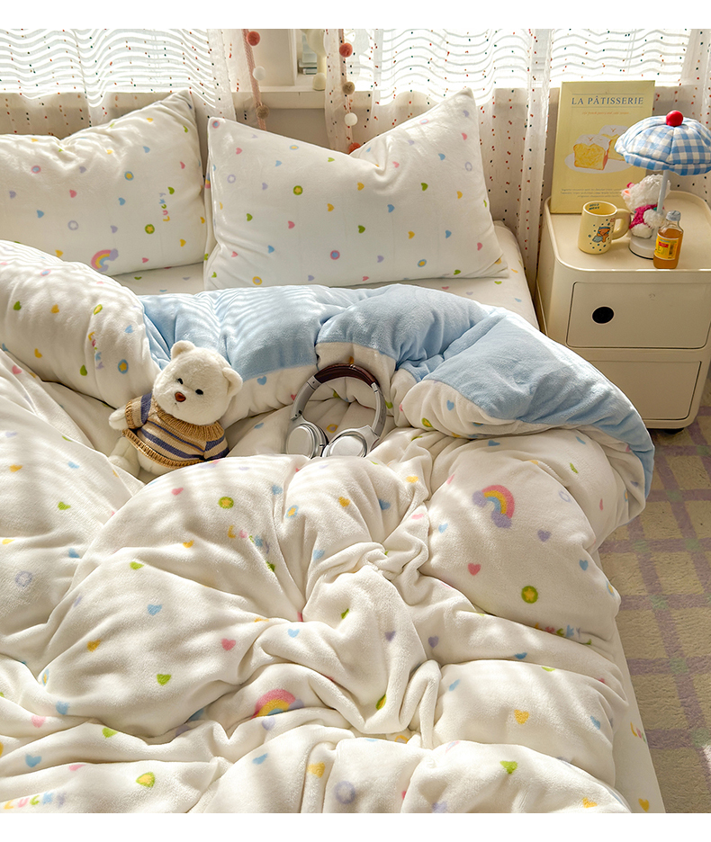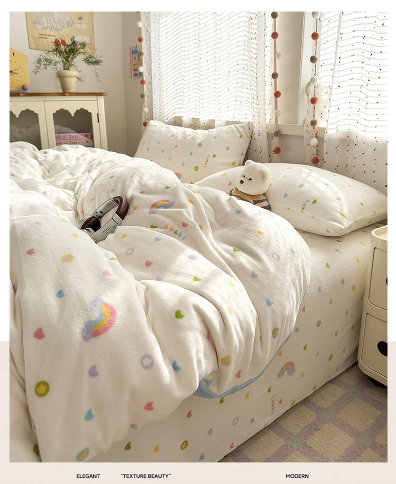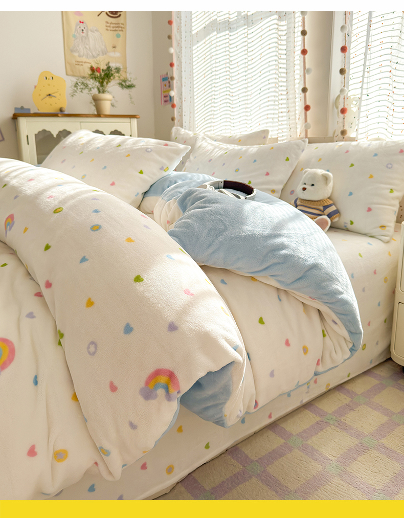 当前位置: 91家纺网 > 商品网购 > 床品套件 > 四件套 > 牛奶绒四件套 > 沐芷 2025 高克重加厚A类牛奶绒四件套珊瑚绒卡通简约三件套 【绒】彩虹爱心
