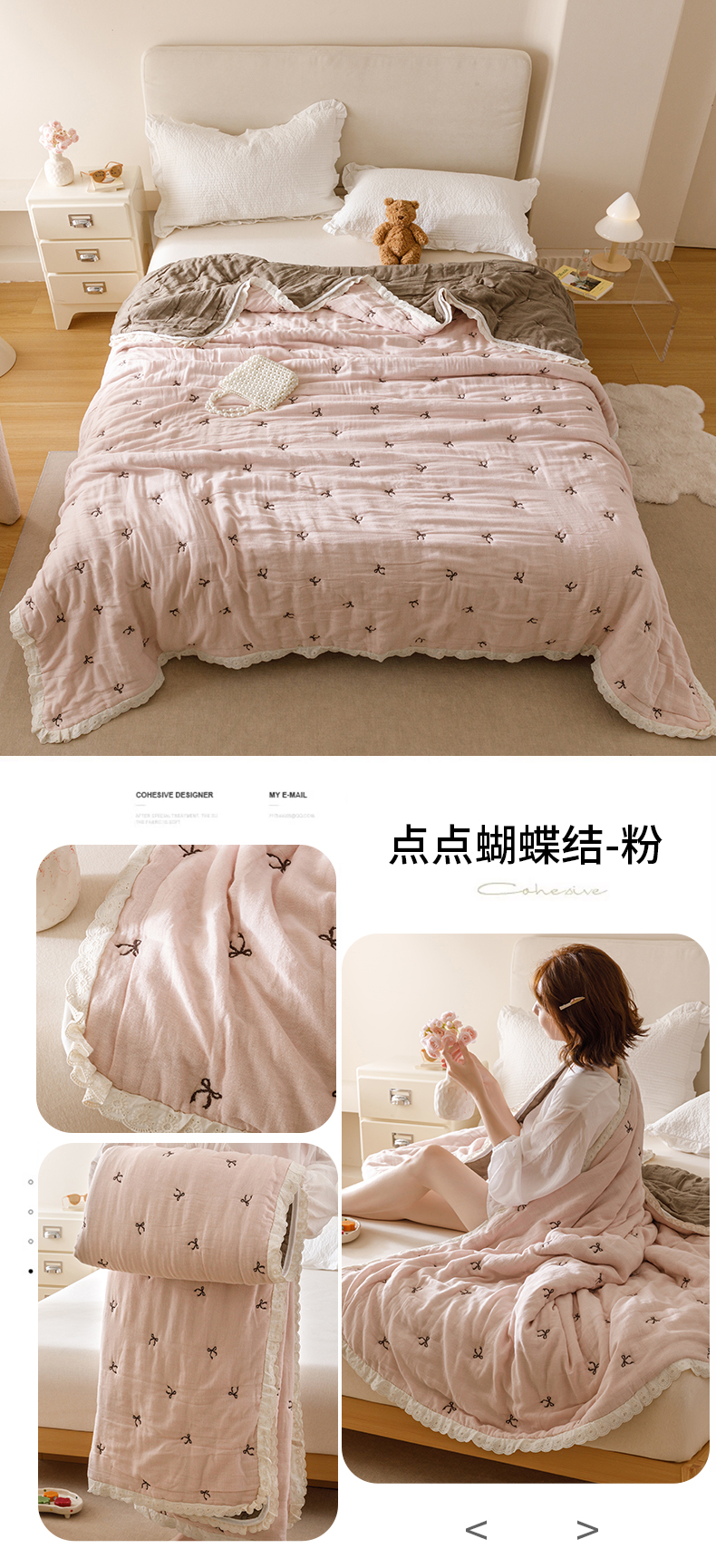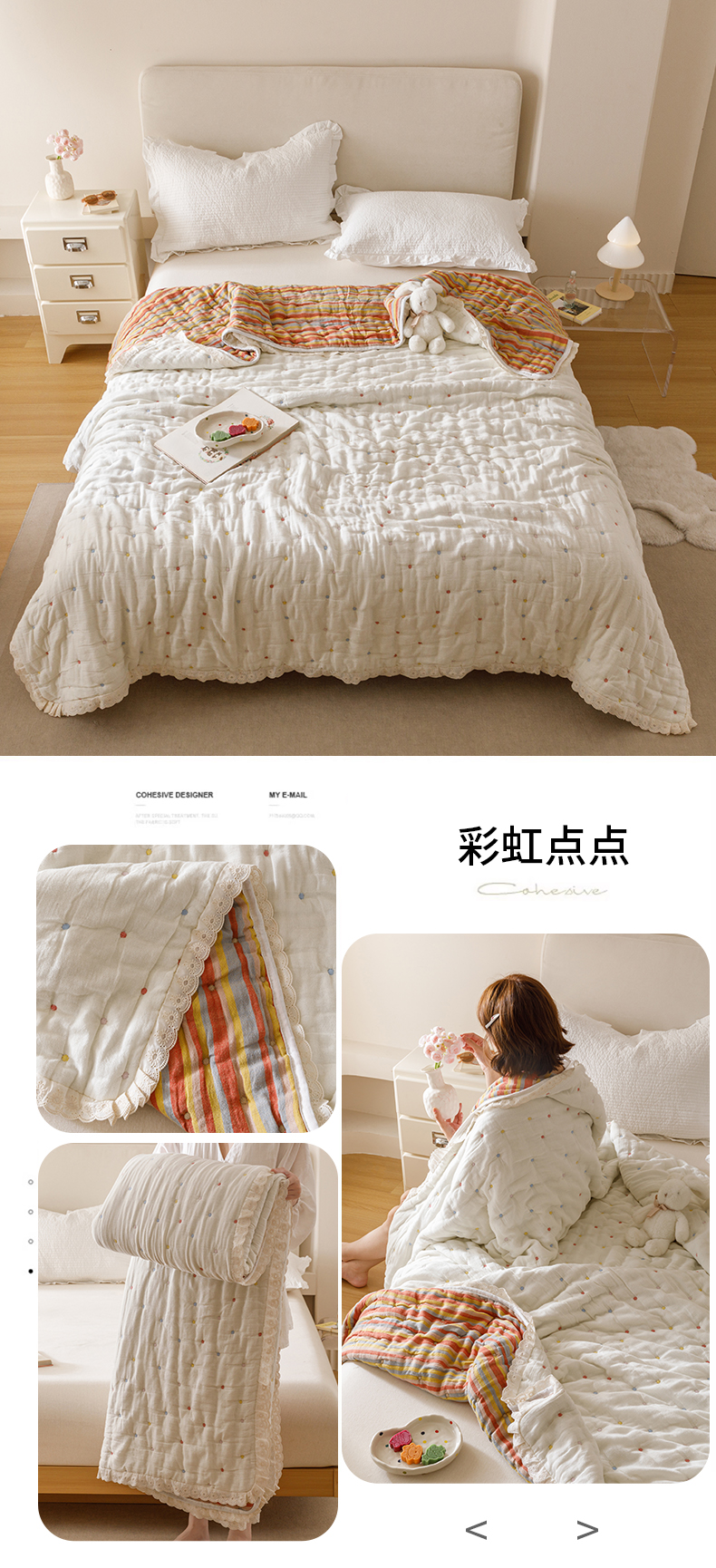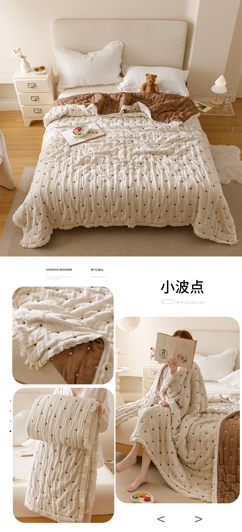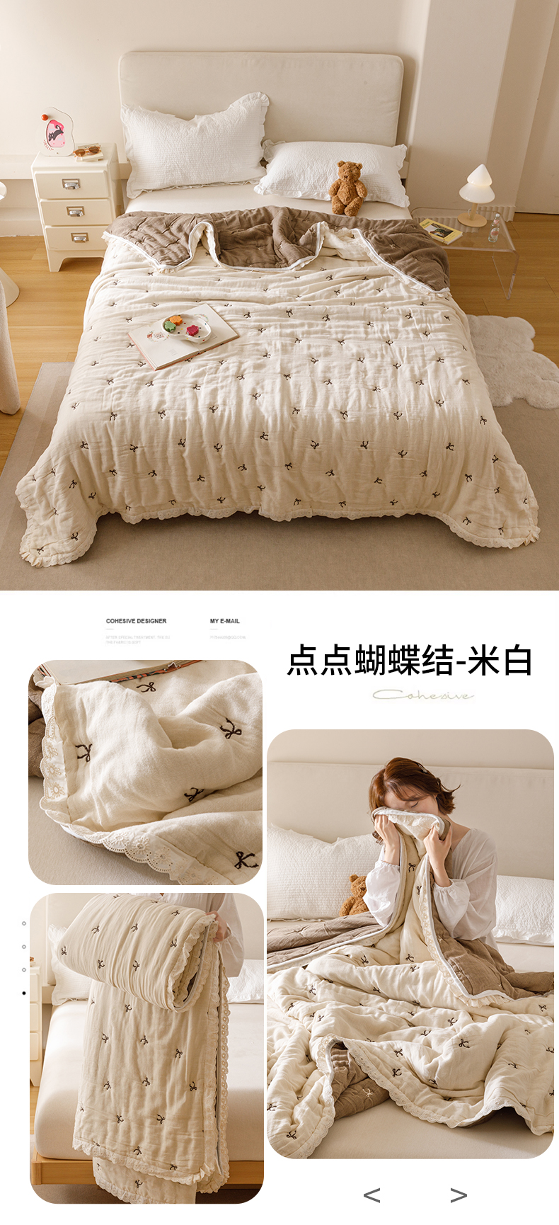 商品名称:麻依 2025新款安心棉十层纱布泡芙被全棉纱布被子被芯 点点蝴蝶结-米白