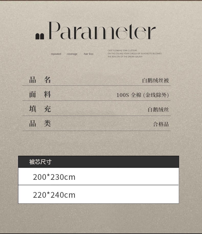白鹅绒丝220*240填充1200克 春秋被 | ¥835.00 |