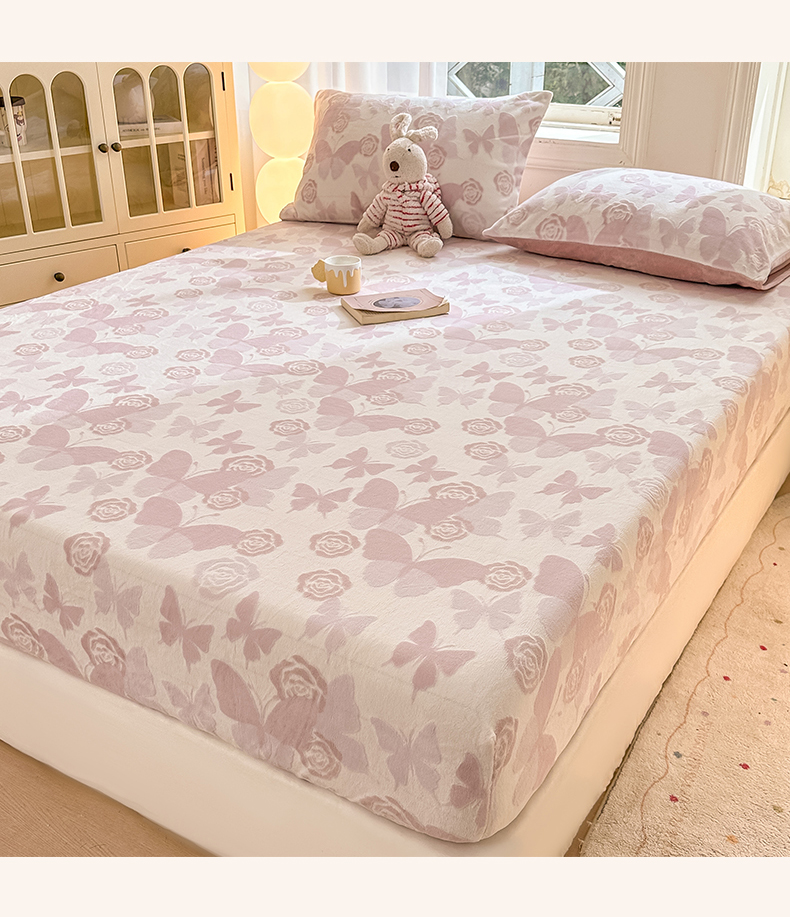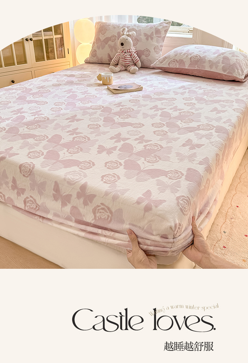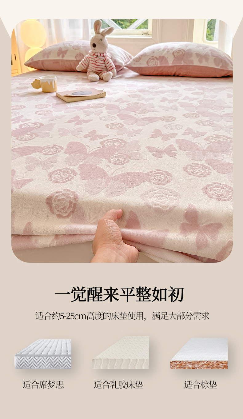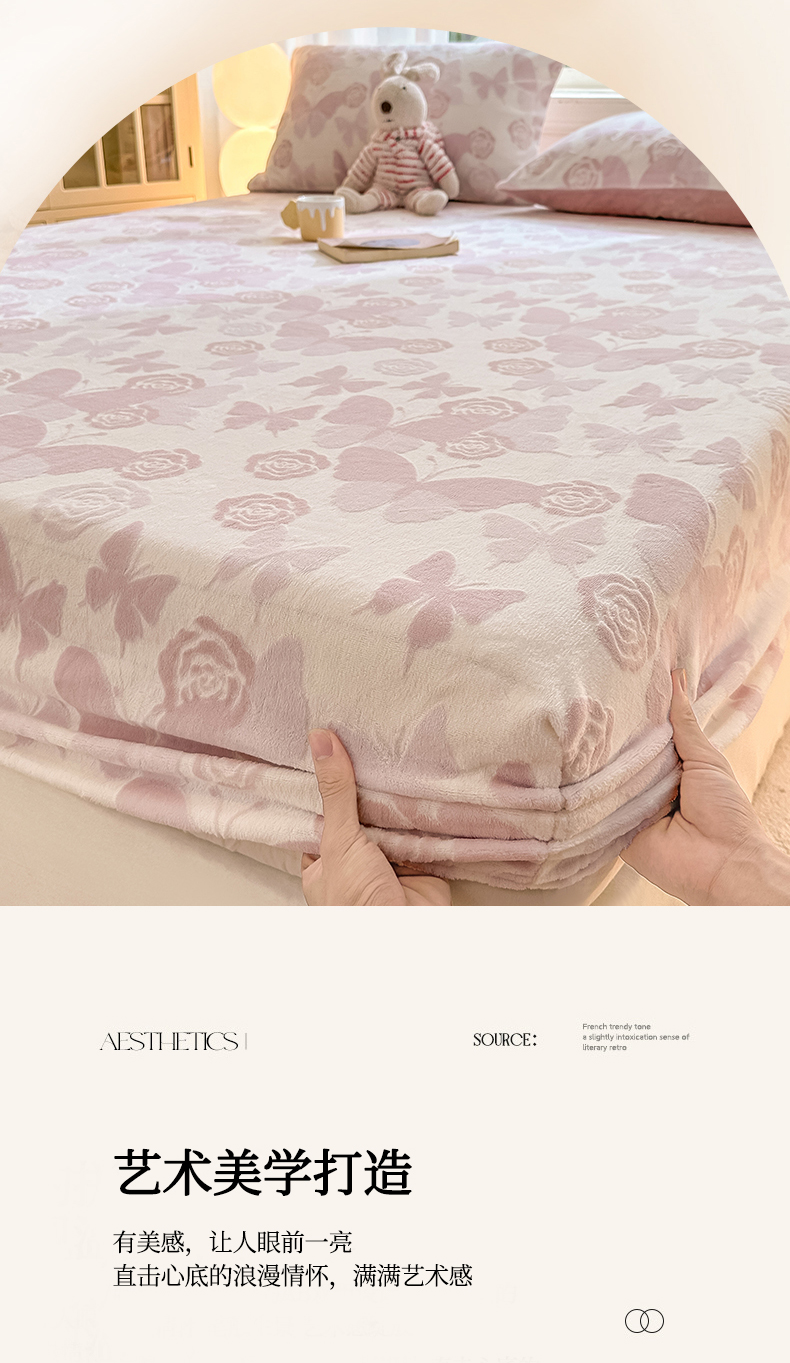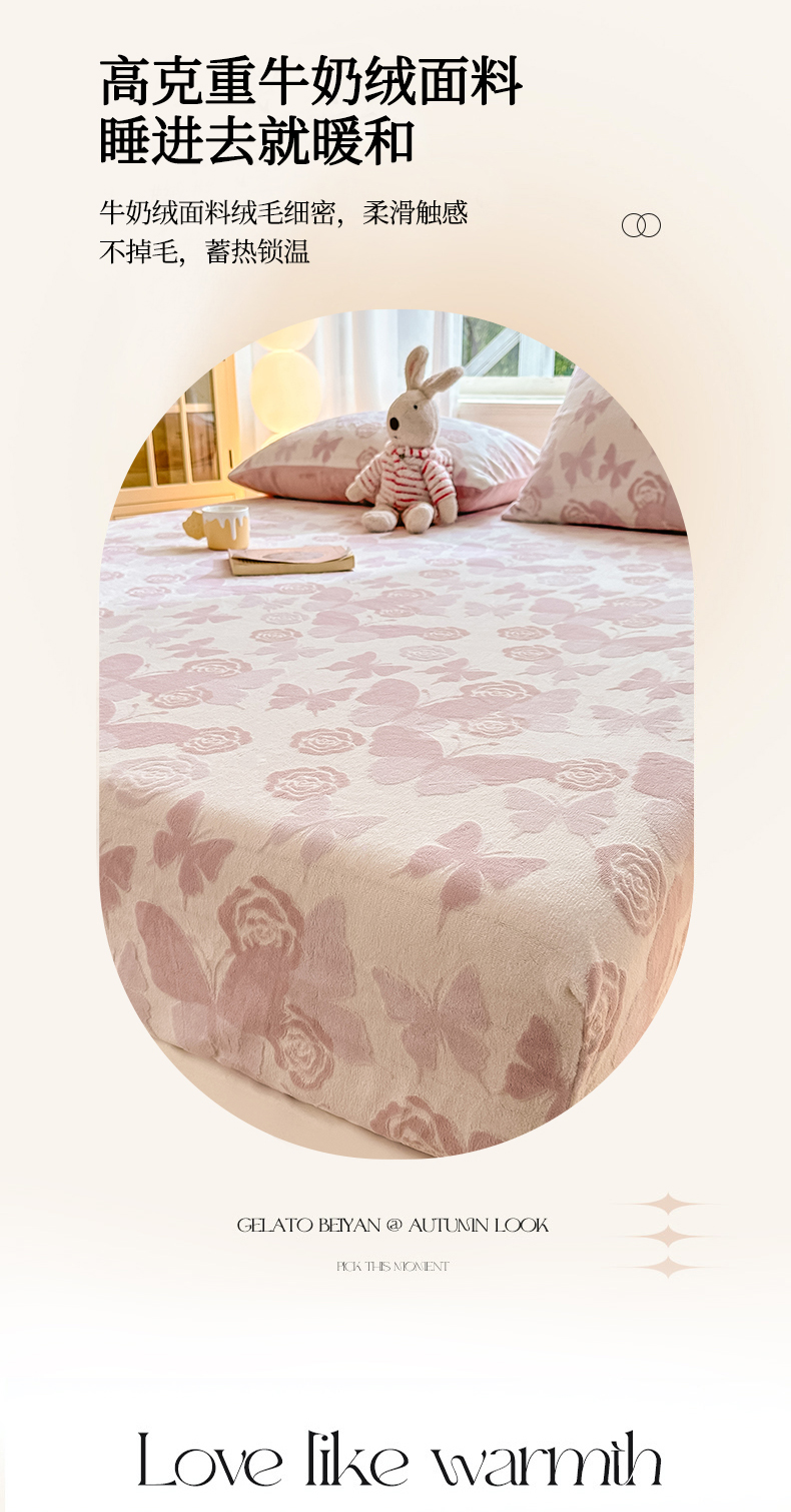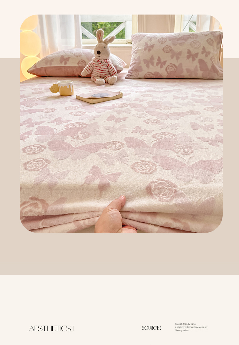 • 91家纺网 家纺一手货源 找家纺 灰鲸 2025新款立体雕花牛奶绒床笠 蝶花-粉