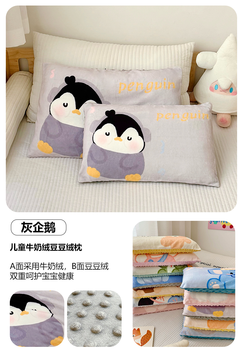 萌宝家纺 2025新款儿童牛奶绒豆豆单品枕套 小企鹅