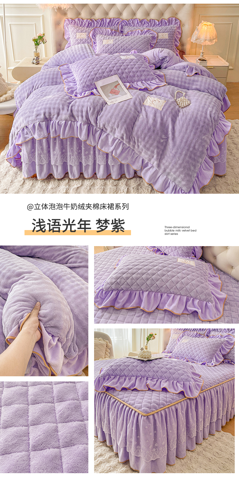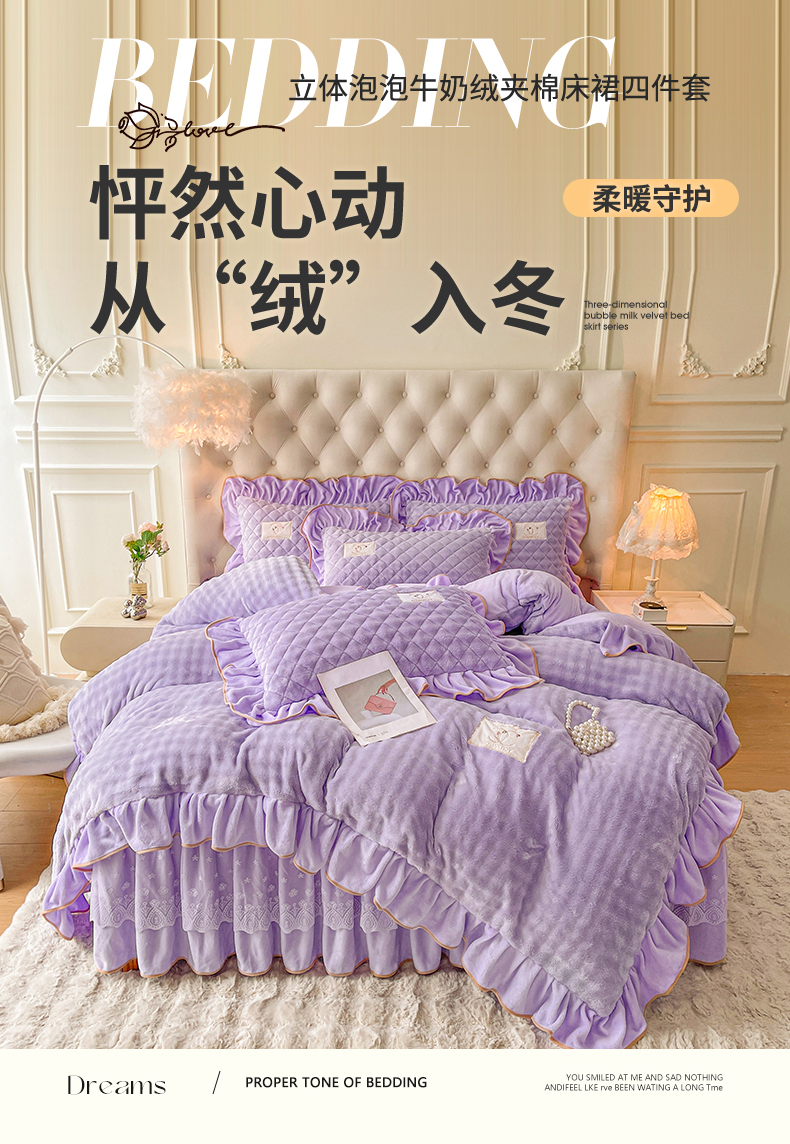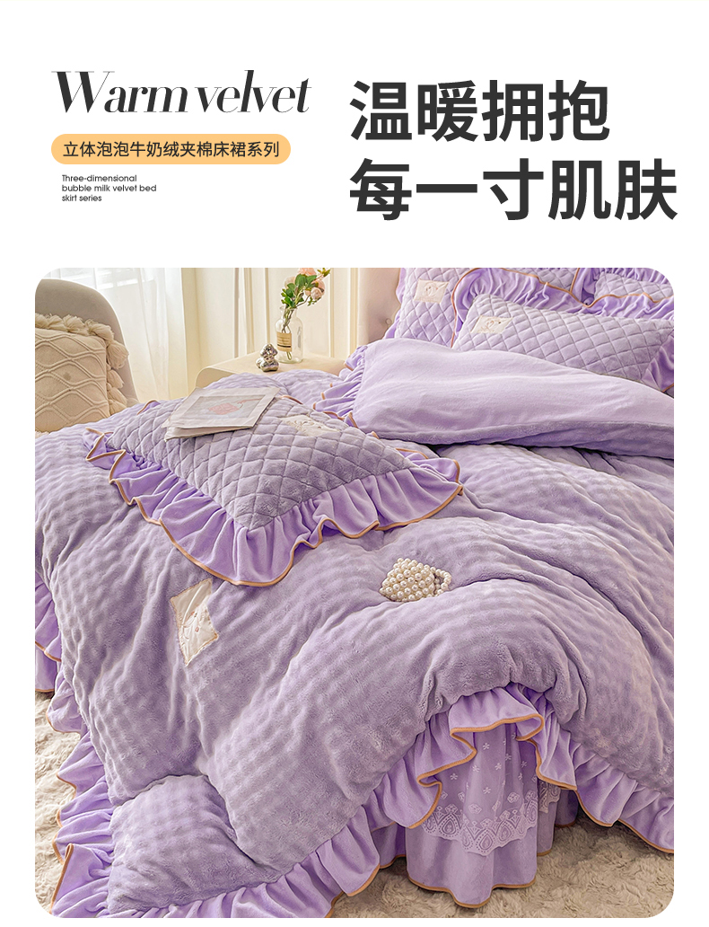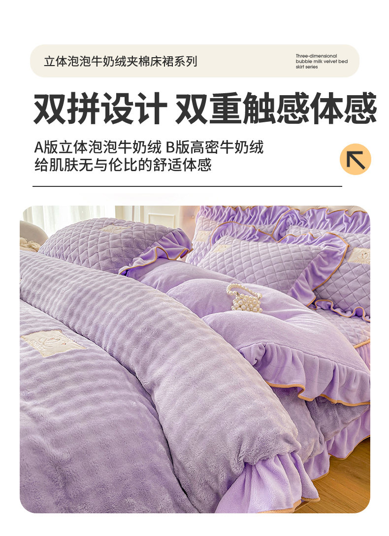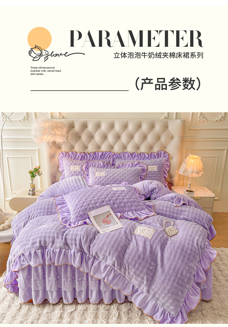 当前位置: 91家纺网 > 商品网购 > 床品套件 > 四件套 > 牛奶绒四件套 > 情恒家纺 2025新款立体泡泡牛奶绒夹棉床裙四件套系列-浅语光年 浅语光年-梦紫