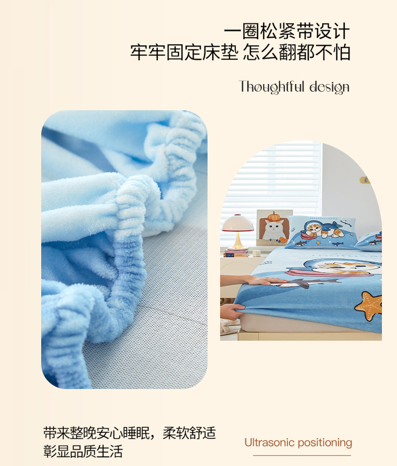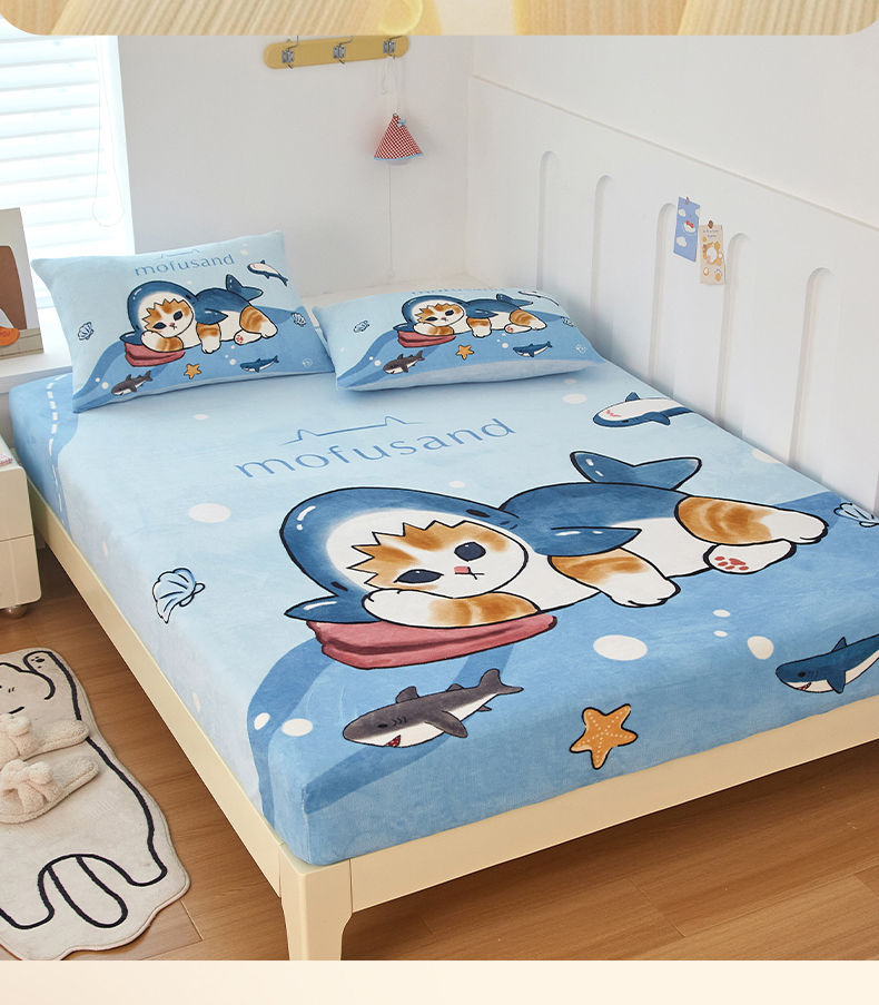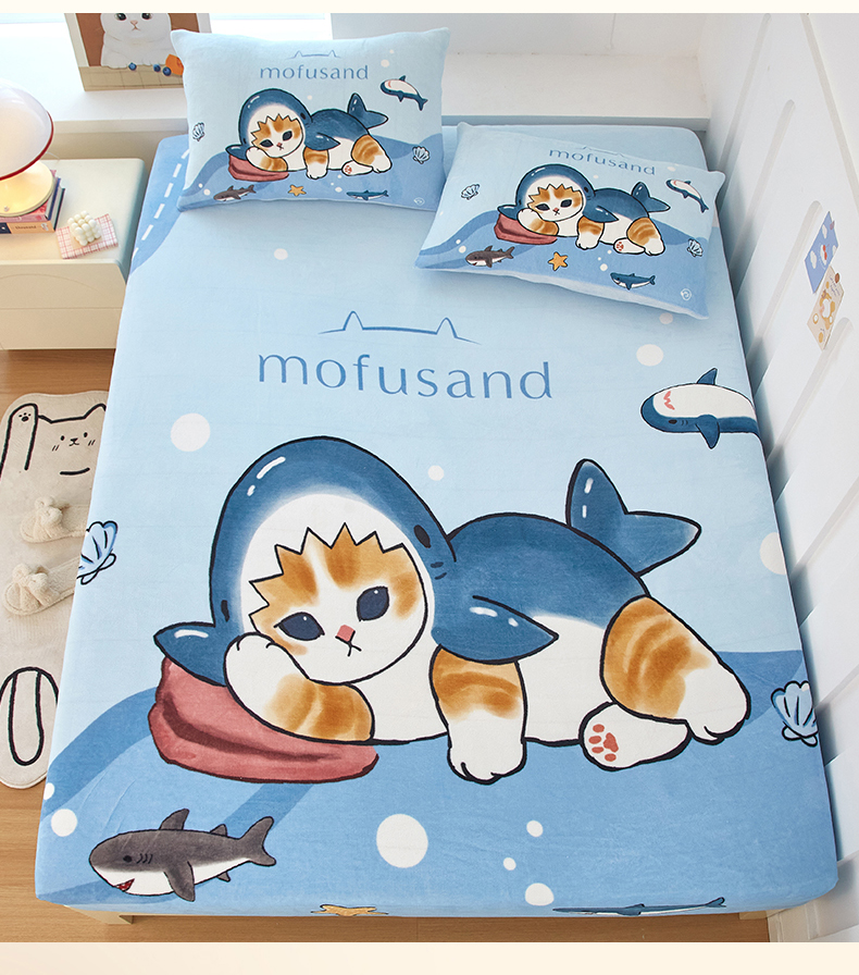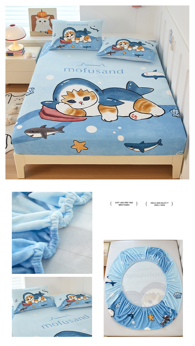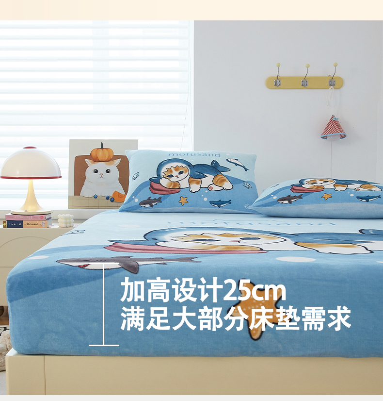 蘭菲家纺 2025新款高克重牛奶绒正版鲨鱼猫系列单品床笠 珊迪沙滩季-猫福