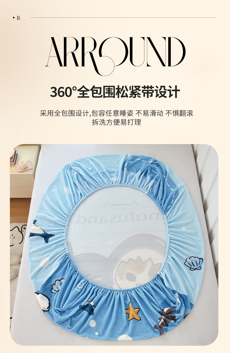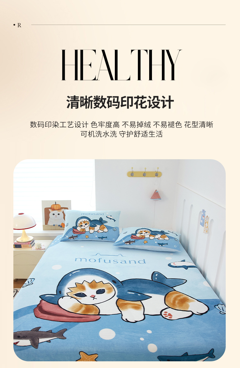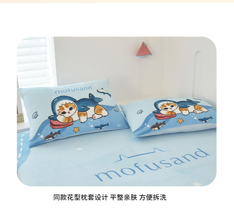 商品名称:蘭菲家纺 2025新款高克重牛奶绒正版鲨鱼猫系列单品床笠 珊迪沙滩季-猫福