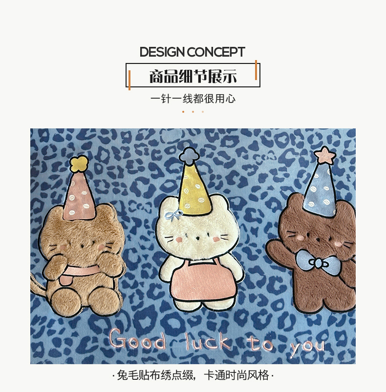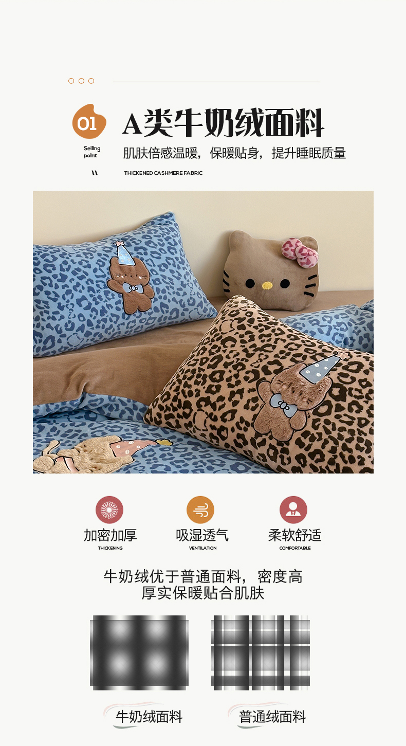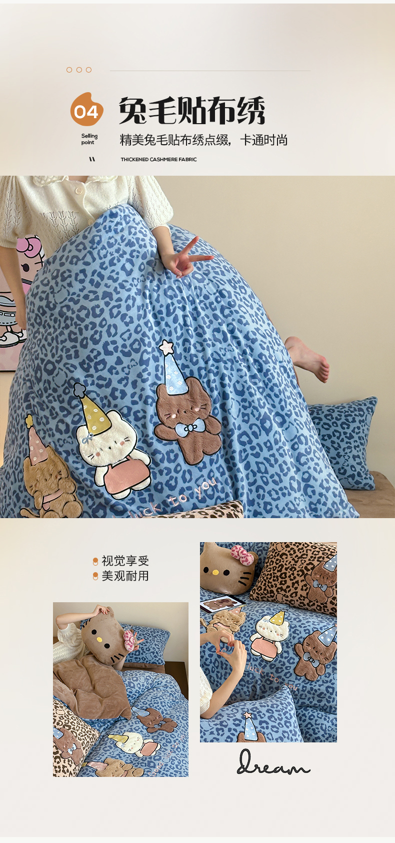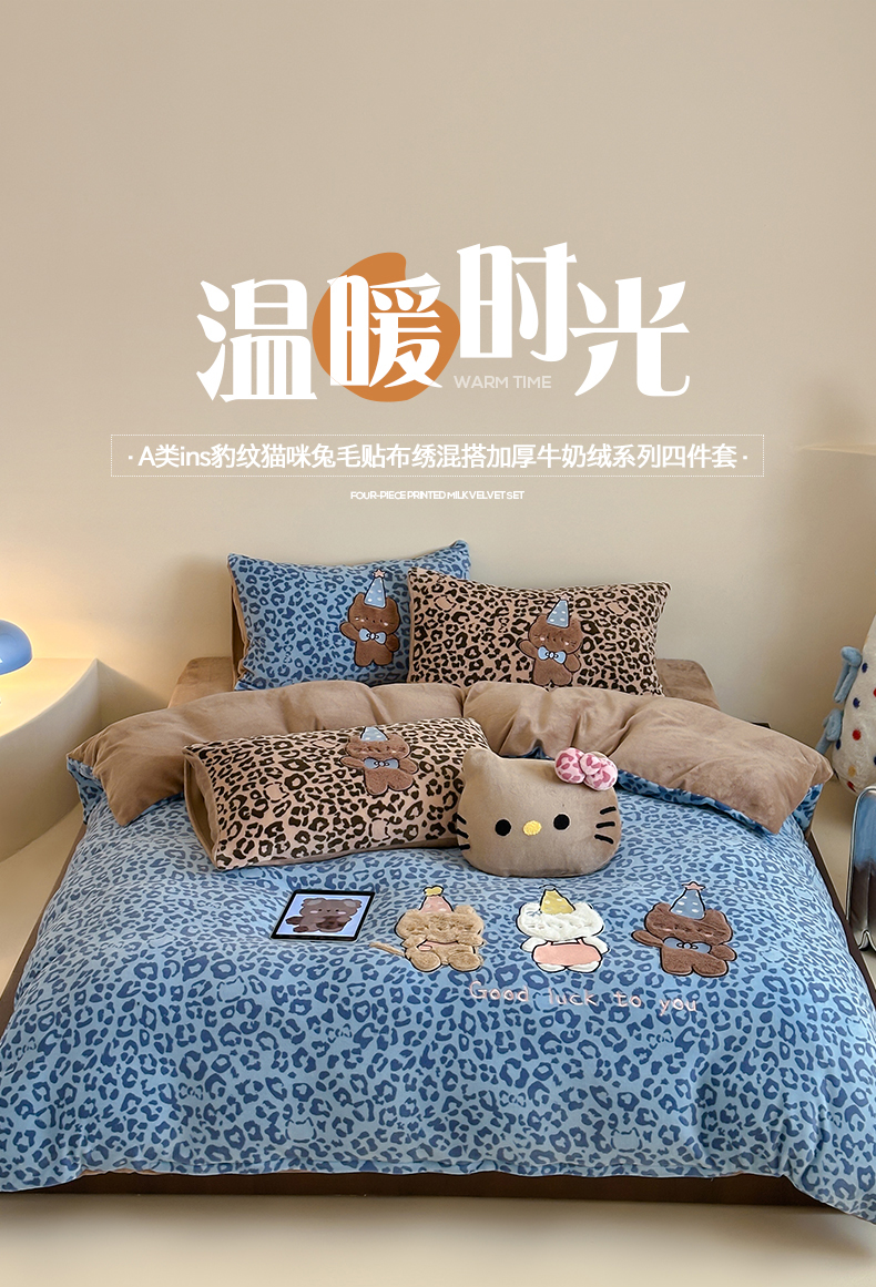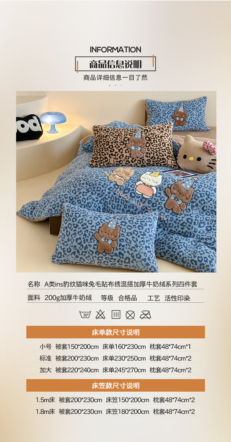 当前位置: 91家纺网 > 商品网购 > 床品套件 > 四件套 > 牛奶绒四件套 > 桃子家居 2025新款A类ins秋冬限定款豹纹黑白皮猫咪兔毛贴布绣工艺刺绣混搭加厚牛奶绒系列四件套 绒贴布绣-豹纹喵三只蓝咖