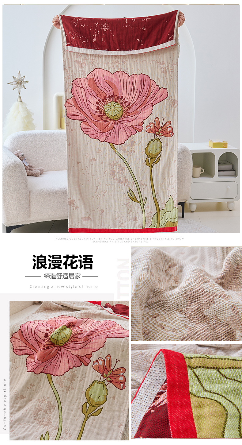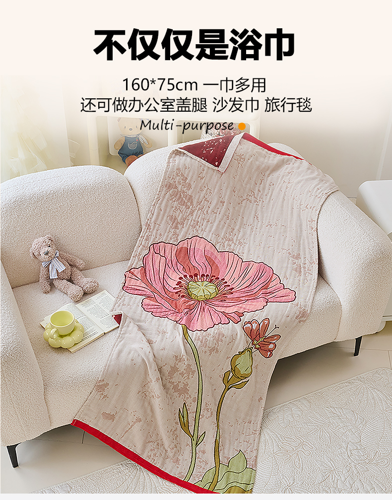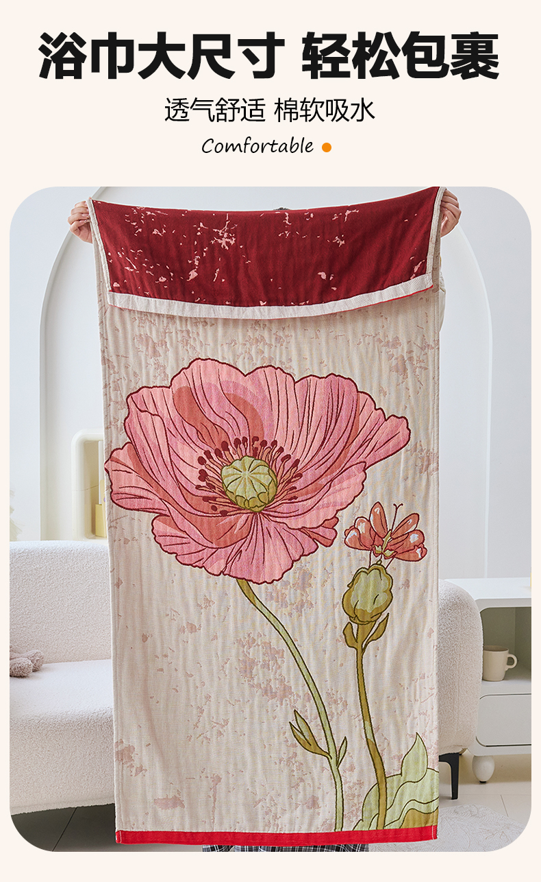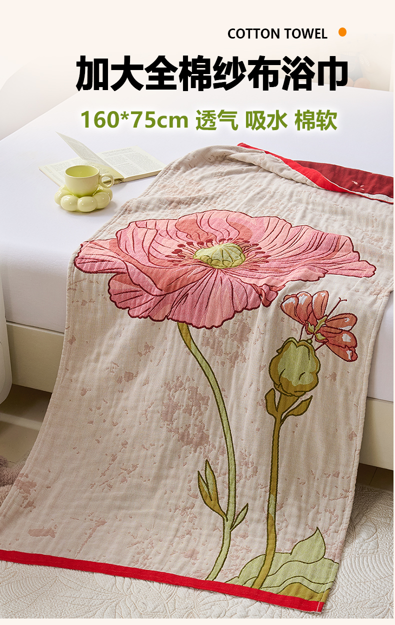 当前位置: 91家纺网 > 商品网购 > 居家日用 > 毛巾/浴巾/浴袍 > 浴巾 > 棠薇家纺 2025新款全棉纱布浴巾纯棉浴巾时尚卡通色织提花四季加大浴巾擦身巾 浪漫花语 160*75cm
