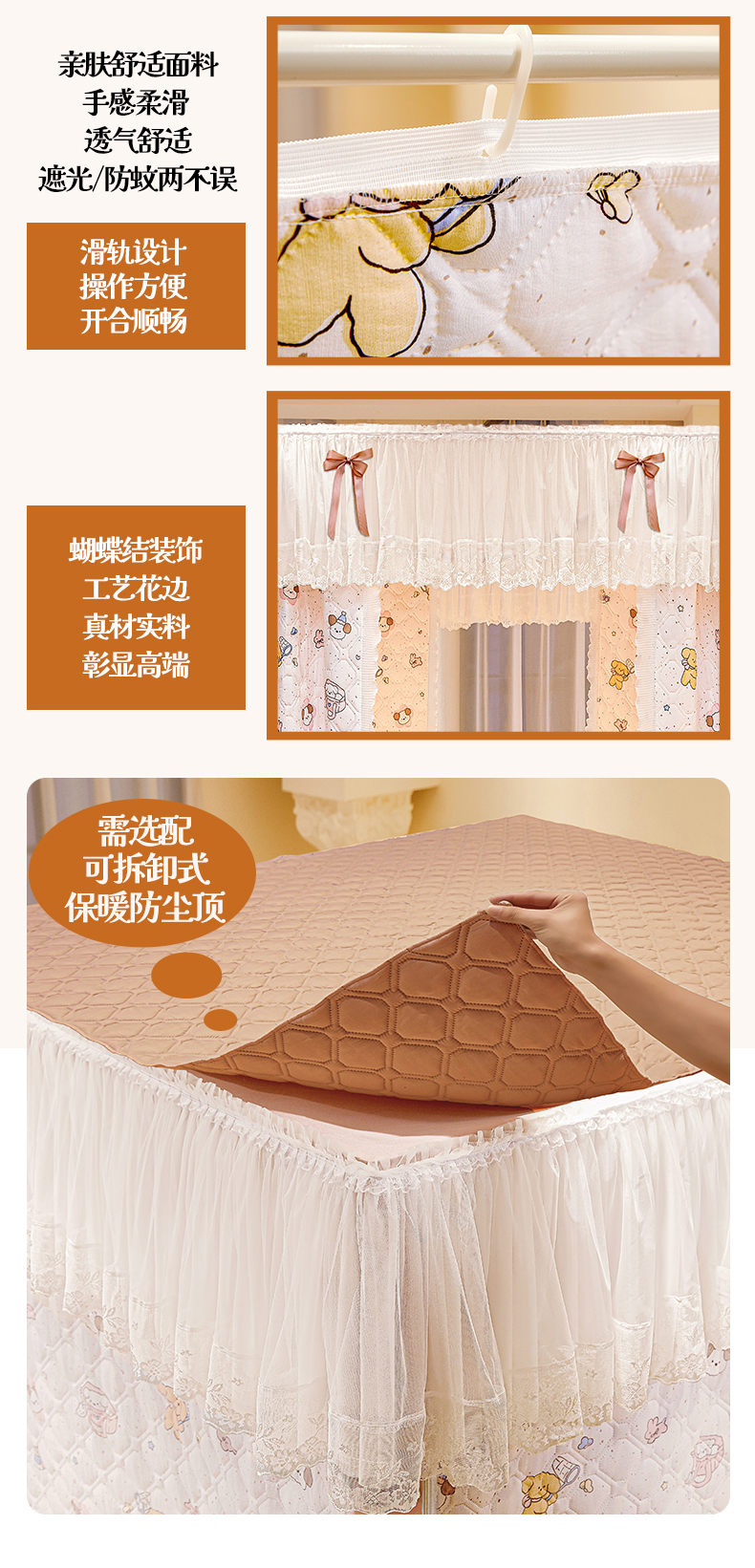 • 91家纺网 家纺一手货源 找家纺 (总)夏彩 2025新款蕾丝U型防摔坐床蚊帐-88630,绿雅灰,藕玉色,香槟色