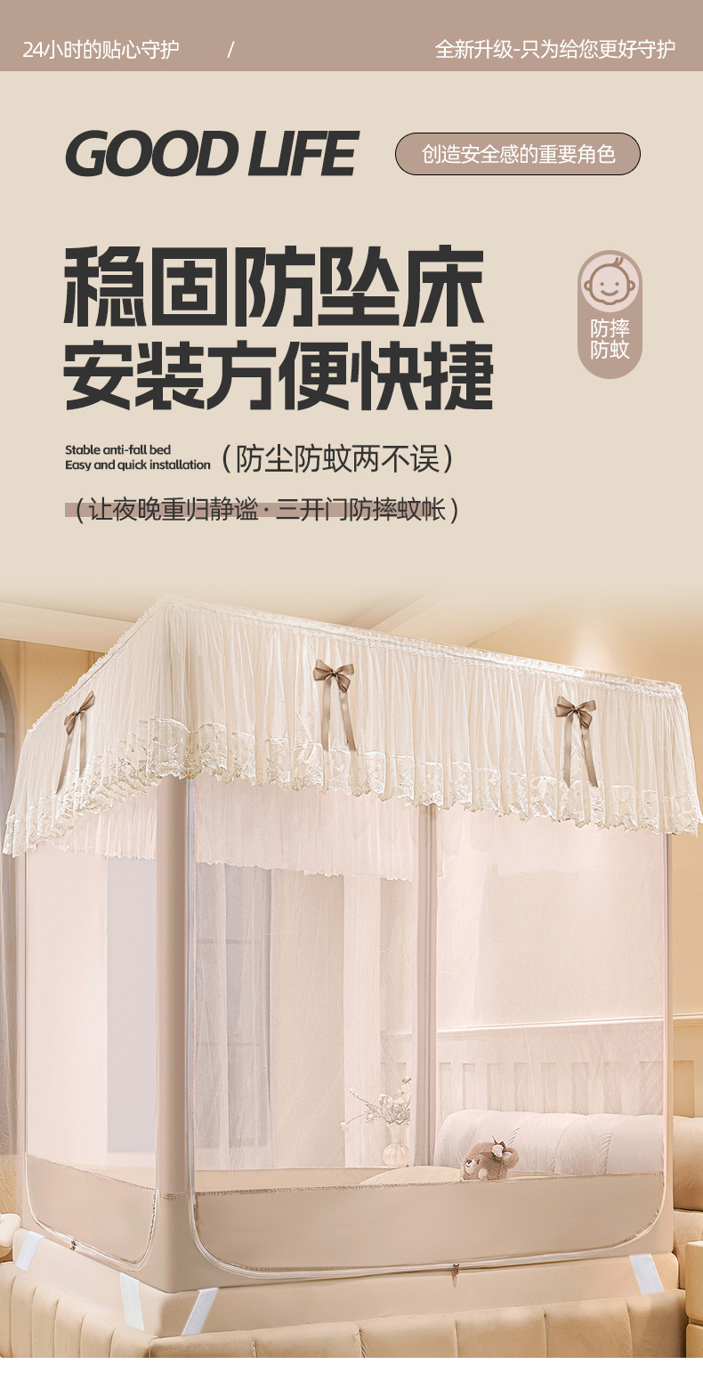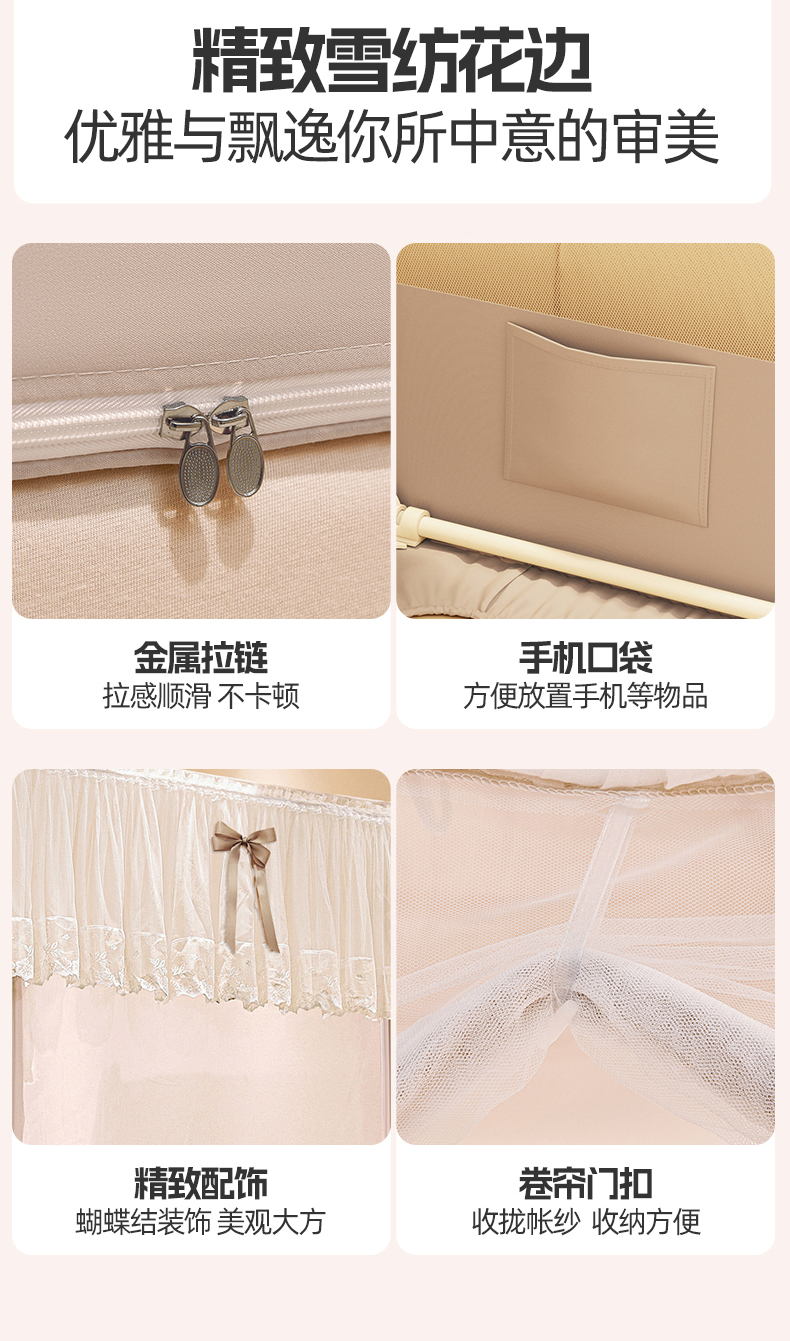 商品名称:夏彩 2025新款蕾丝U型防摔坐床蚊帐-88630 香槟色