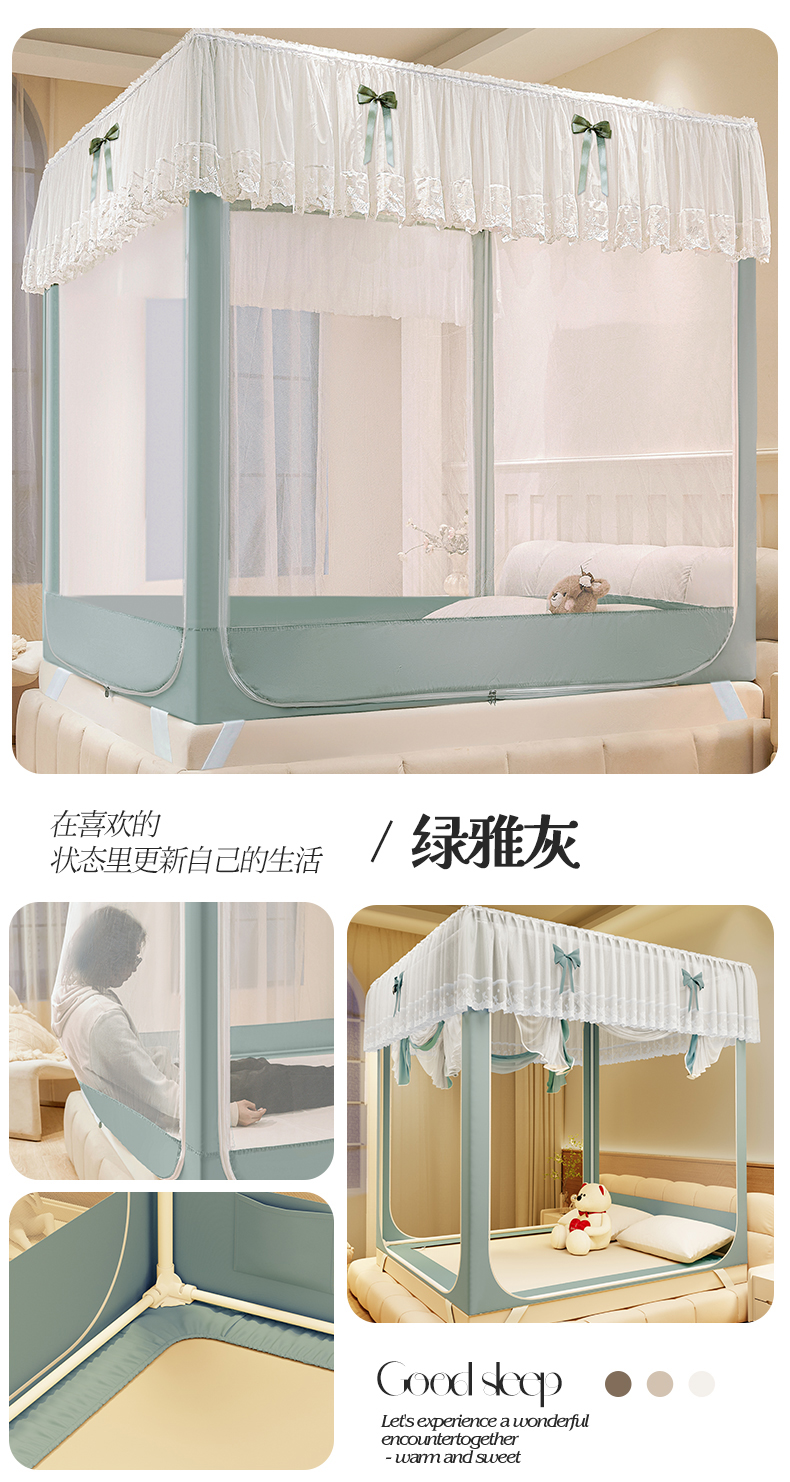 (总)夏彩 2025新款蕾丝U型防摔坐床蚊帐-88630,绿雅灰,藕玉色,香槟色