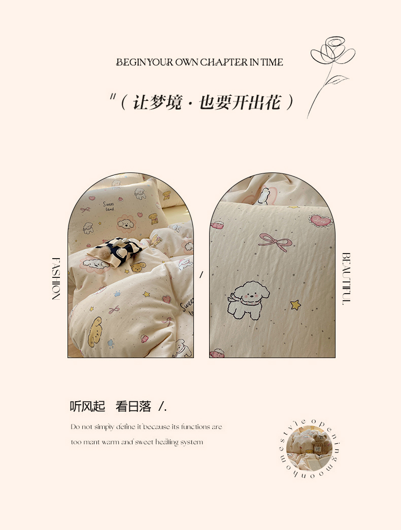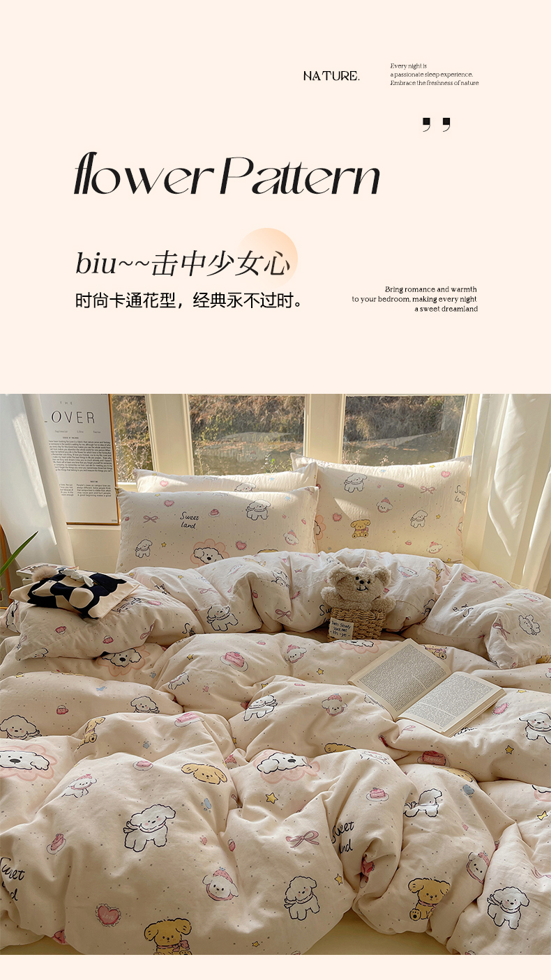 (总)六巷胡同 2025新款 INS减龄可爱风卡通全棉四件套第五系(森林音乐会系列),波点嘟嘟猫,点点面包犬,调皮蔷薇狗,哈喽泡芙猫,蓝格插画犬,森林音乐会