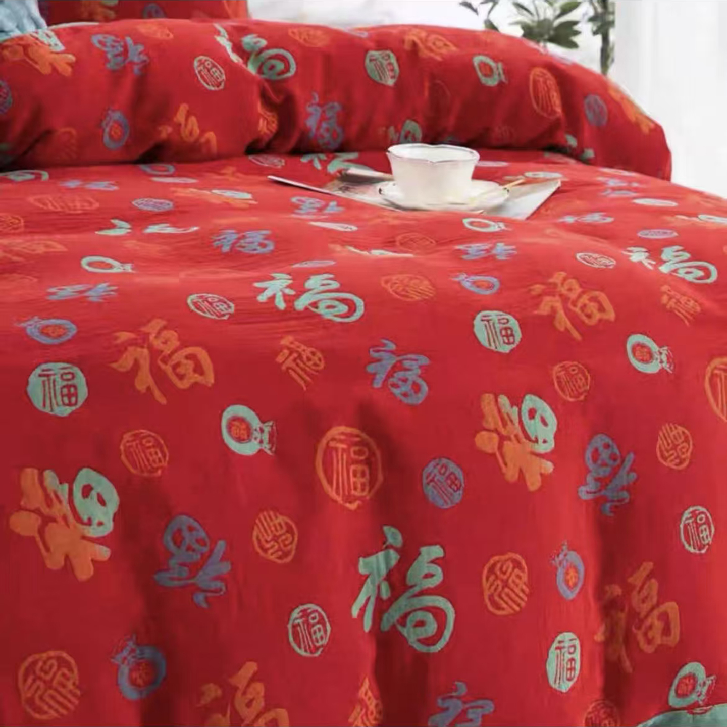 禧多家纺 2025新款年货爆款大红双层纱四件套 百福来财