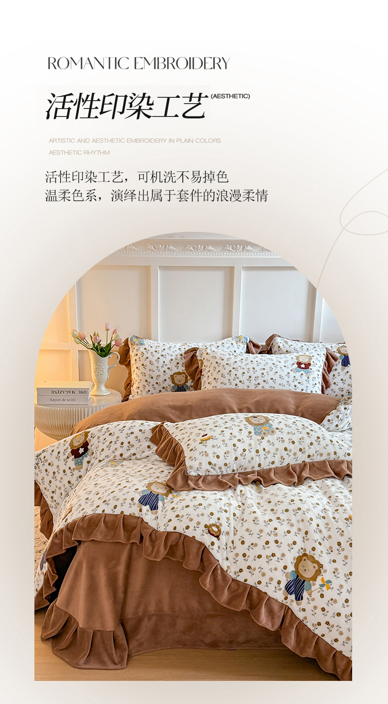 商品名称:温眠家纺 2025新款200g全工艺牛奶绒花边款四件套吊边床单 快乐狮子