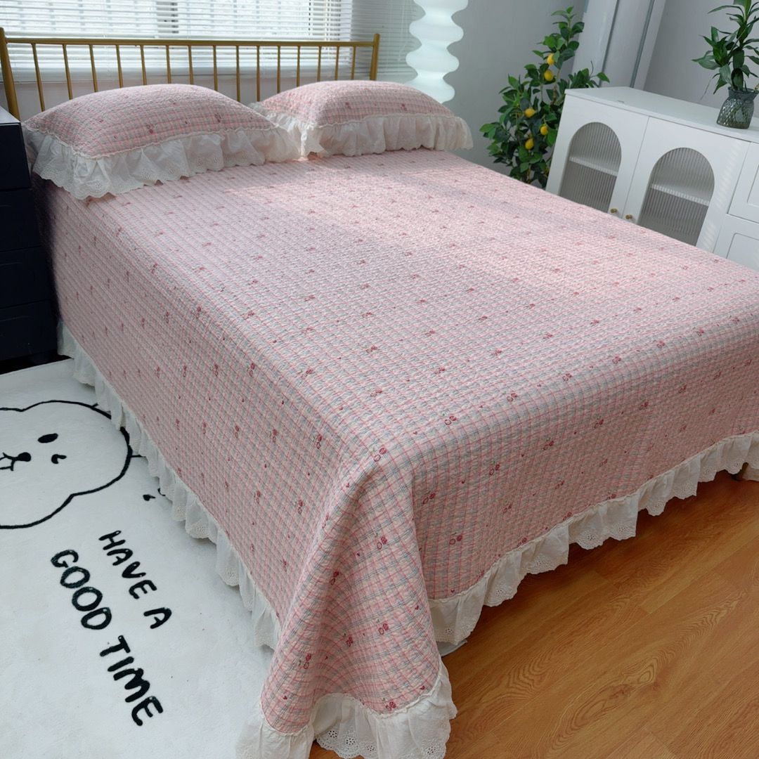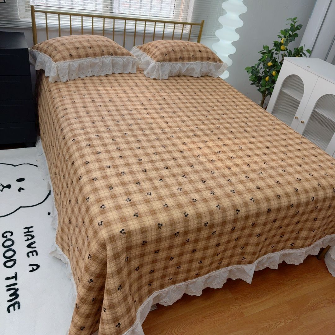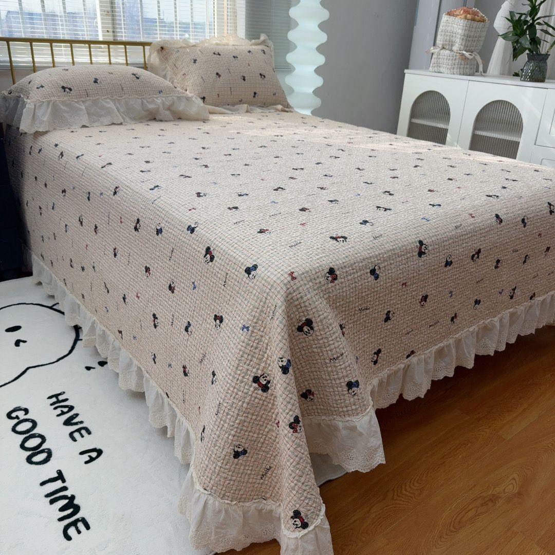 (总)暖居 2026新款大尺寸双层纱高温砂洗245X265床盖三件套,车厘子,粉绿格,洛璃,米妮,旺旺队,小丸子,樱桃可可,饼干熊,木马,小星星