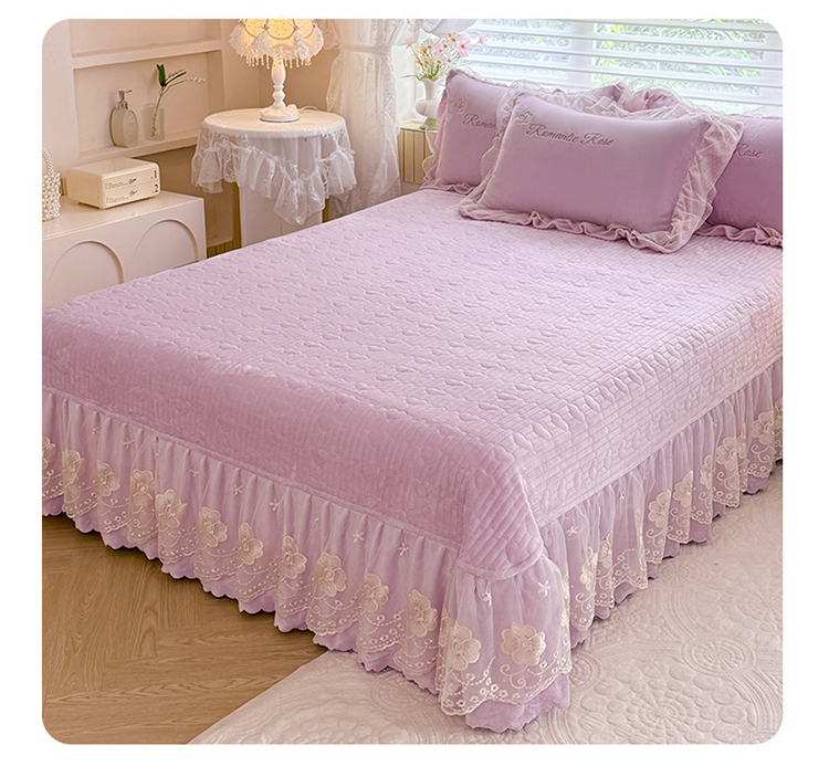 (总)苏米娜2025秋冬直播爆款11斤230g全消光牛奶绒夹棉床盖款四件套纯色蕾丝花边刺绣床盖三件套夹棉单床盖