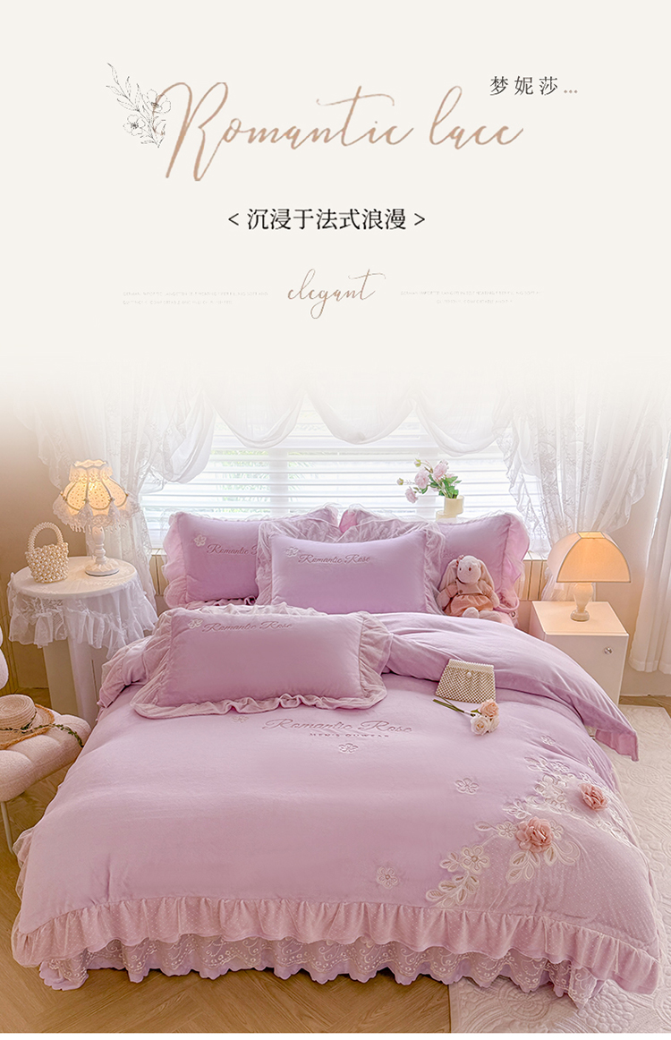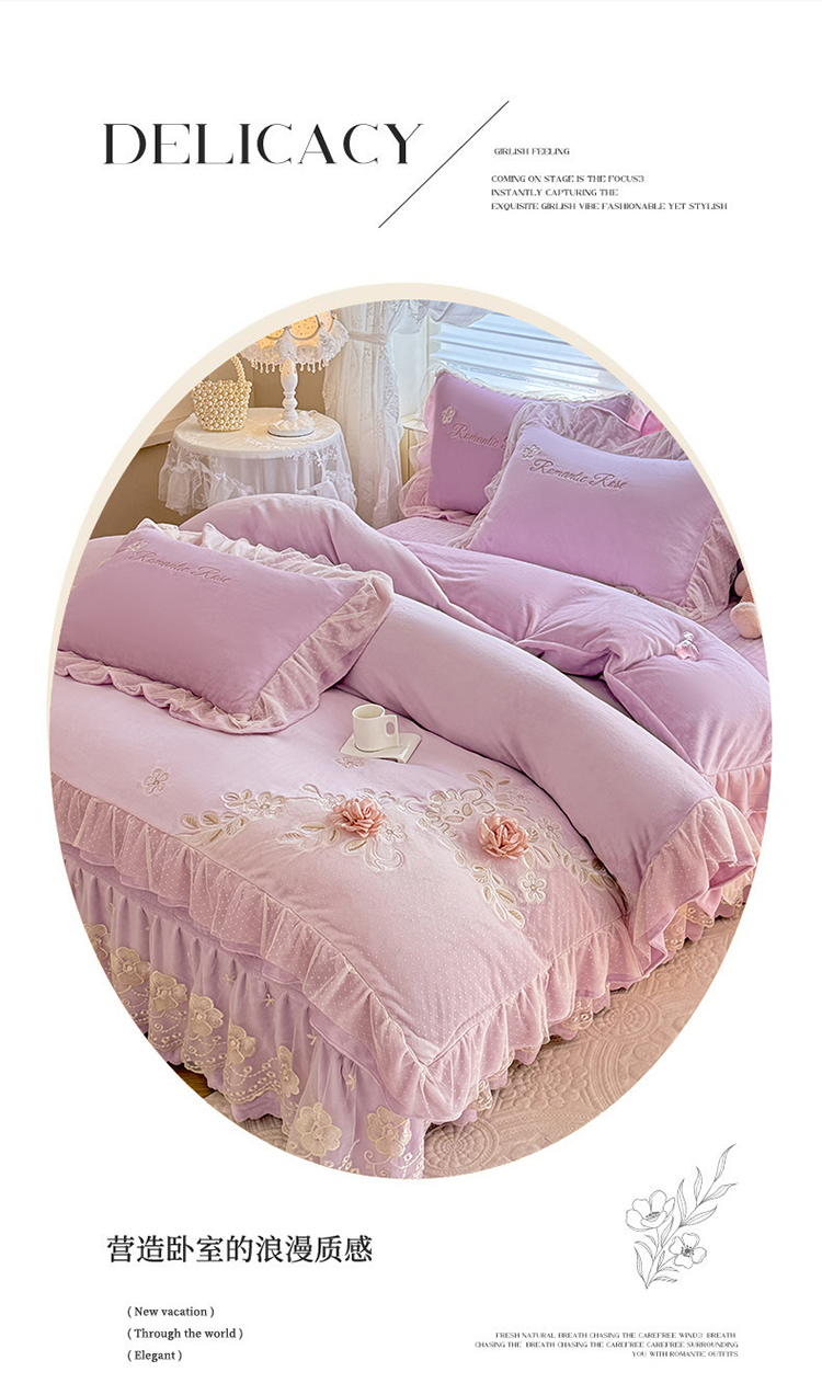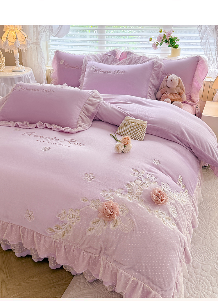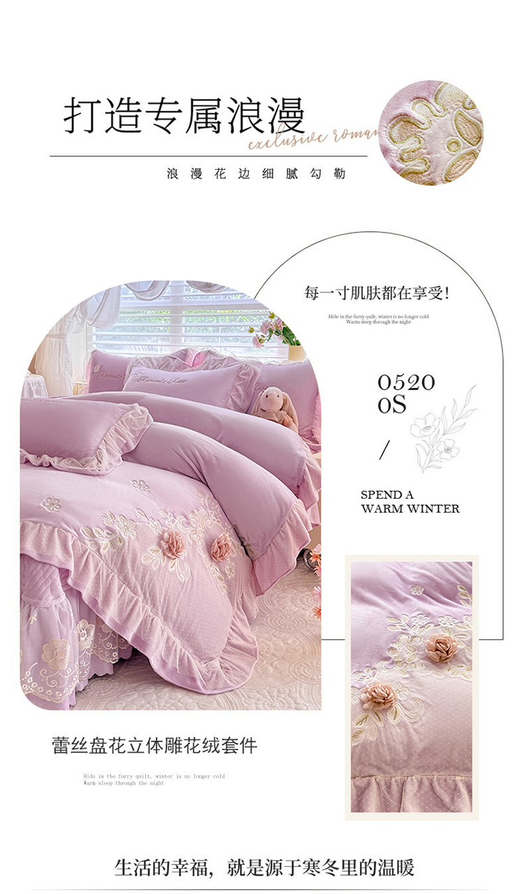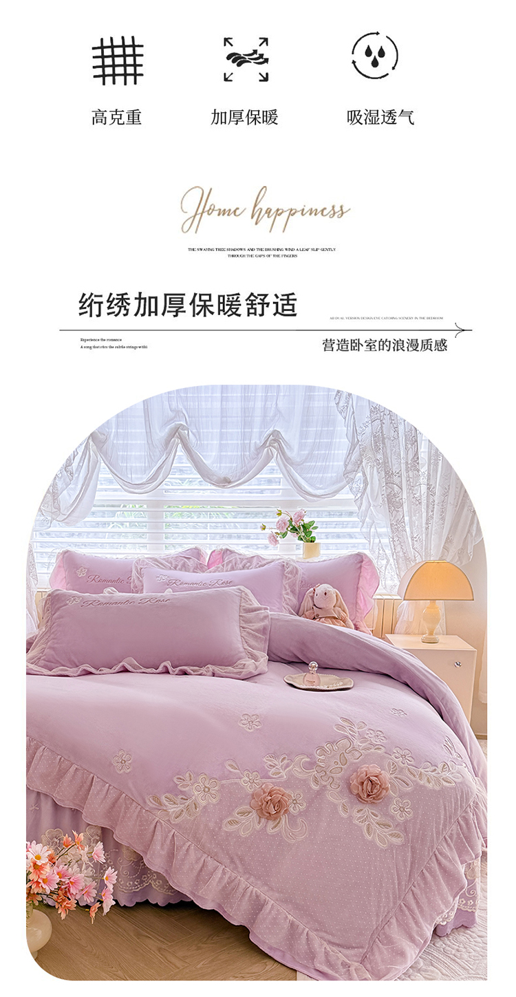 (总)苏米娜家纺SUMINA 2025新款230g高克重韩版立体盘花牛奶蚕丝绒绣花四件套床裙款被套-洛丽塔系列,洛丽塔-嫩黄 ,洛丽塔-香芋紫,洛丽塔-珍珠粉, 洛丽塔-婴儿蓝