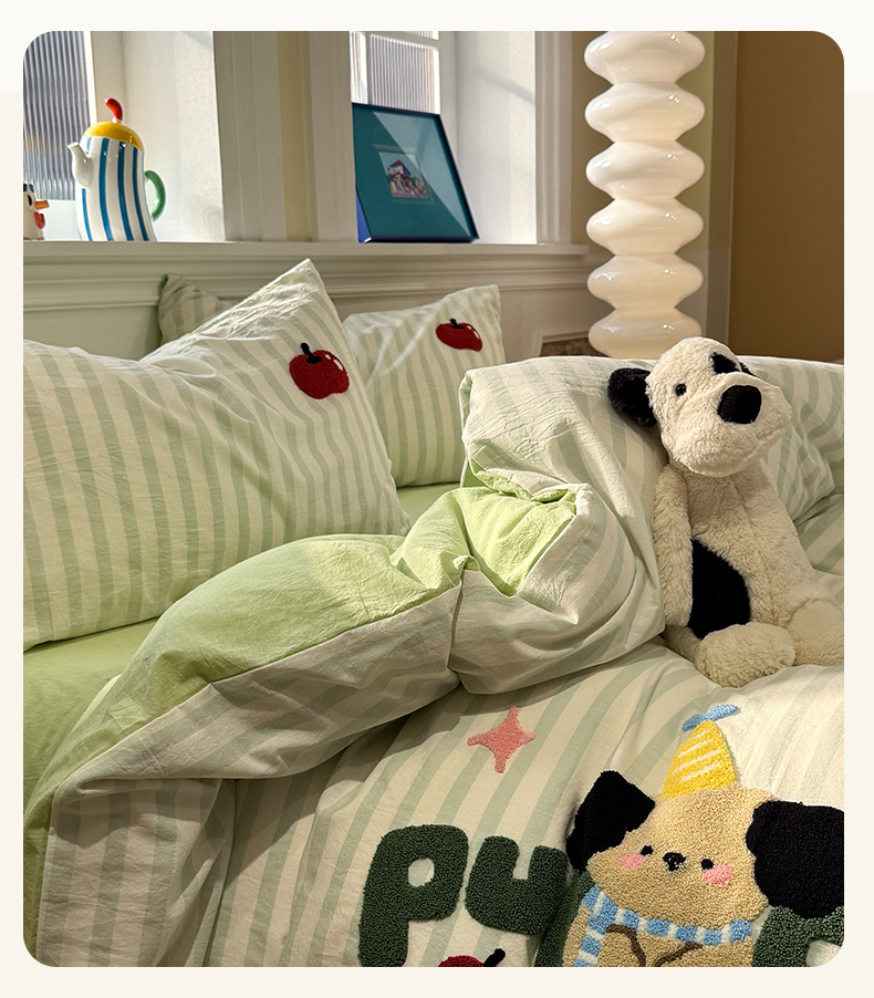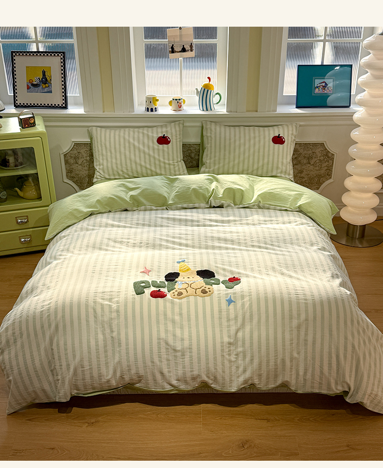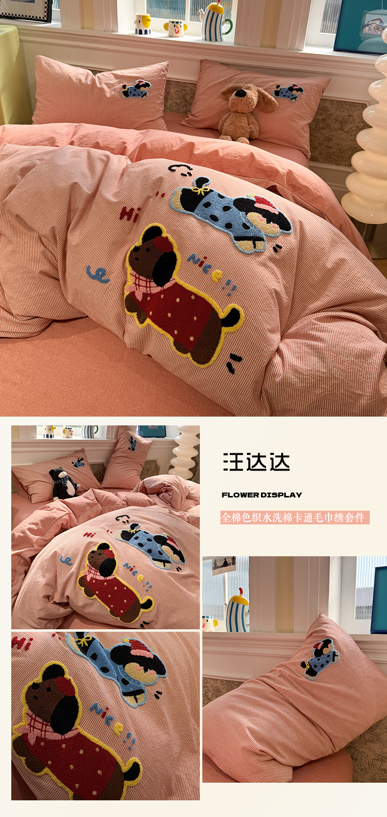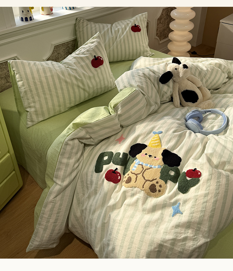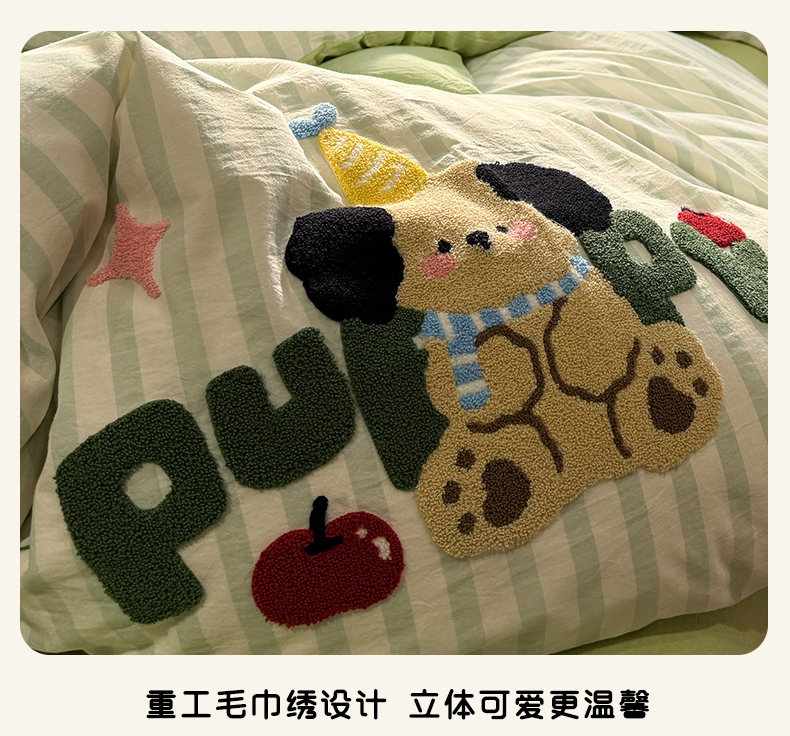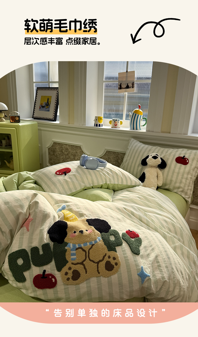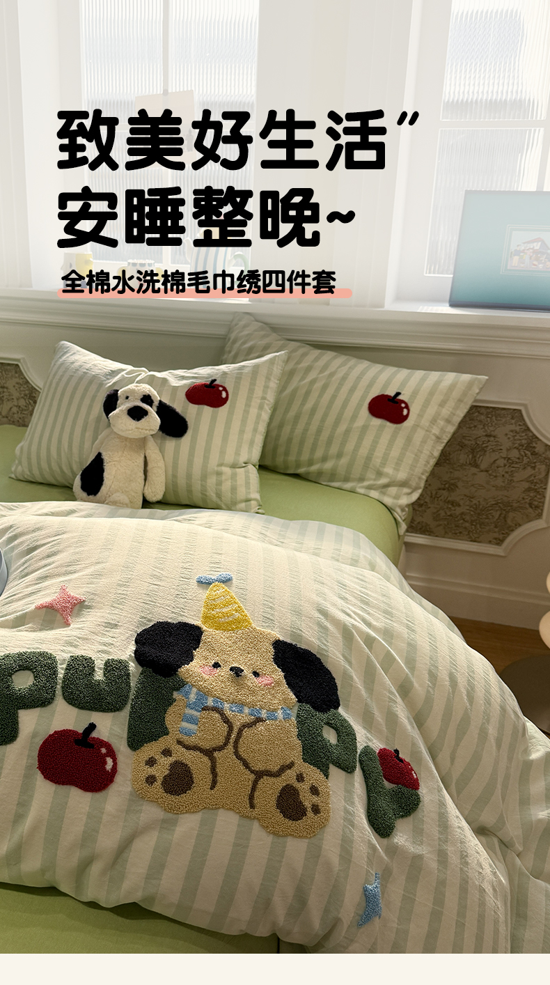 曼町家居 2026春夏全棉纯棉水洗棉毛巾绣四件套 噗噗狗