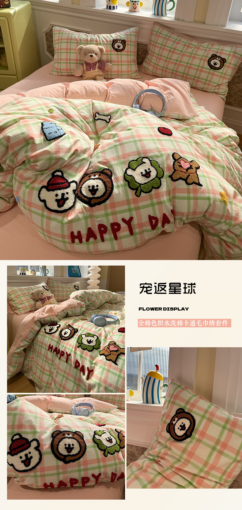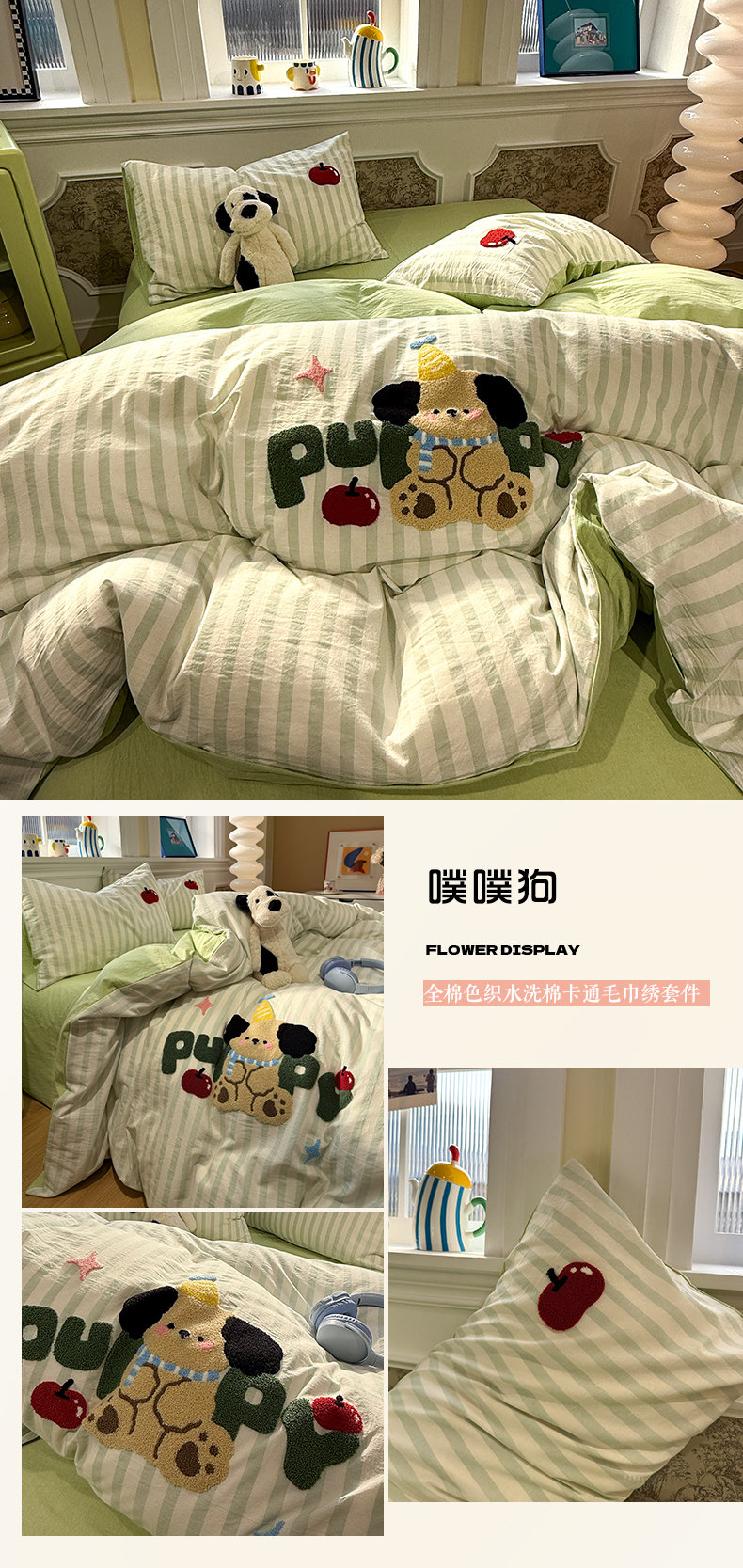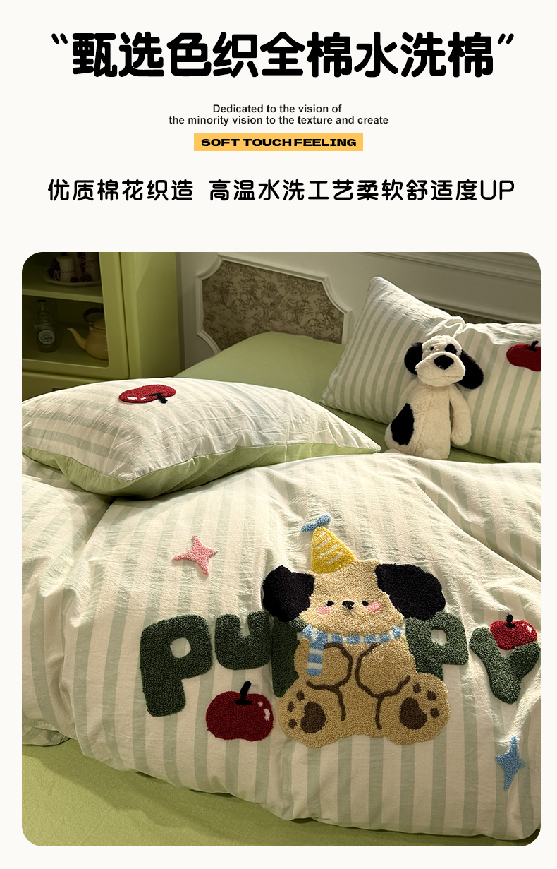 商品名称:曼町家居 2026春夏全棉纯棉水洗棉毛巾绣四件套 噗噗狗