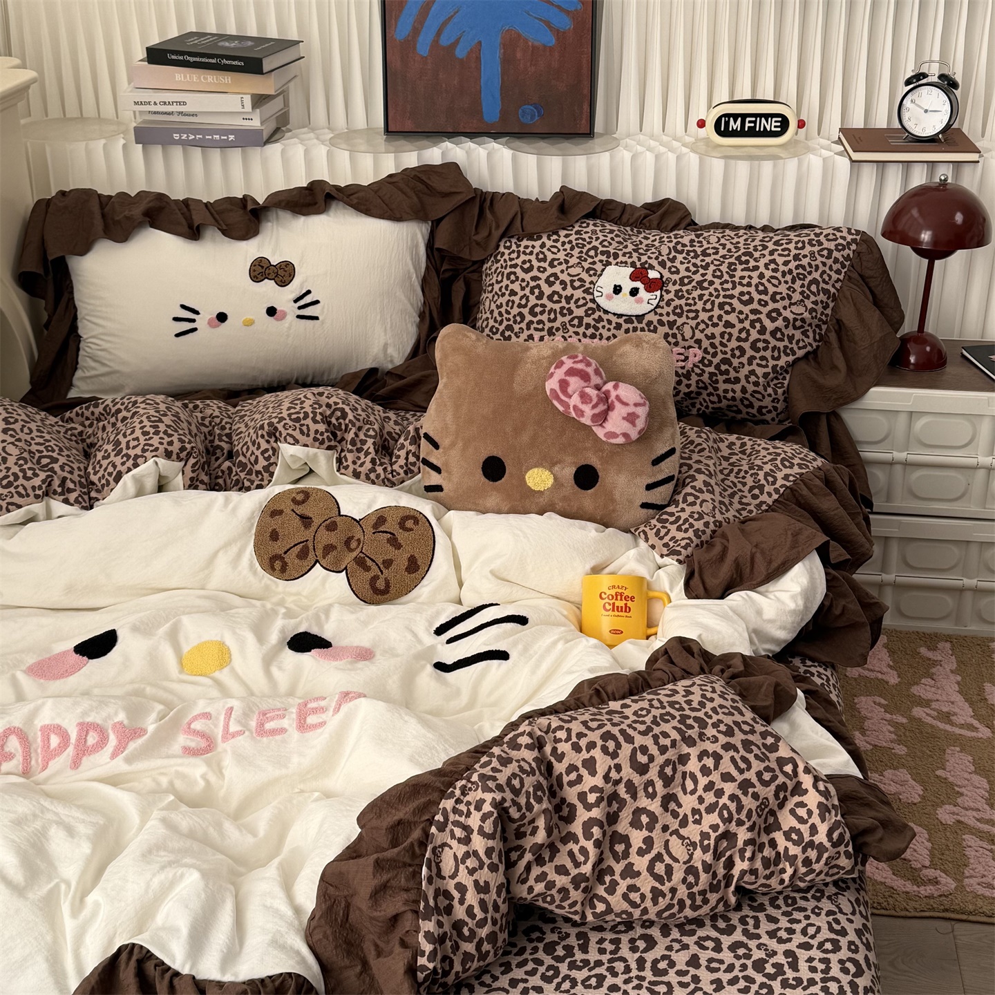 拾一 2026新款少女心可爱黑皮KT猫猫花边款毛巾绣木棉四件套 猫猫-棕,猫猫-棕