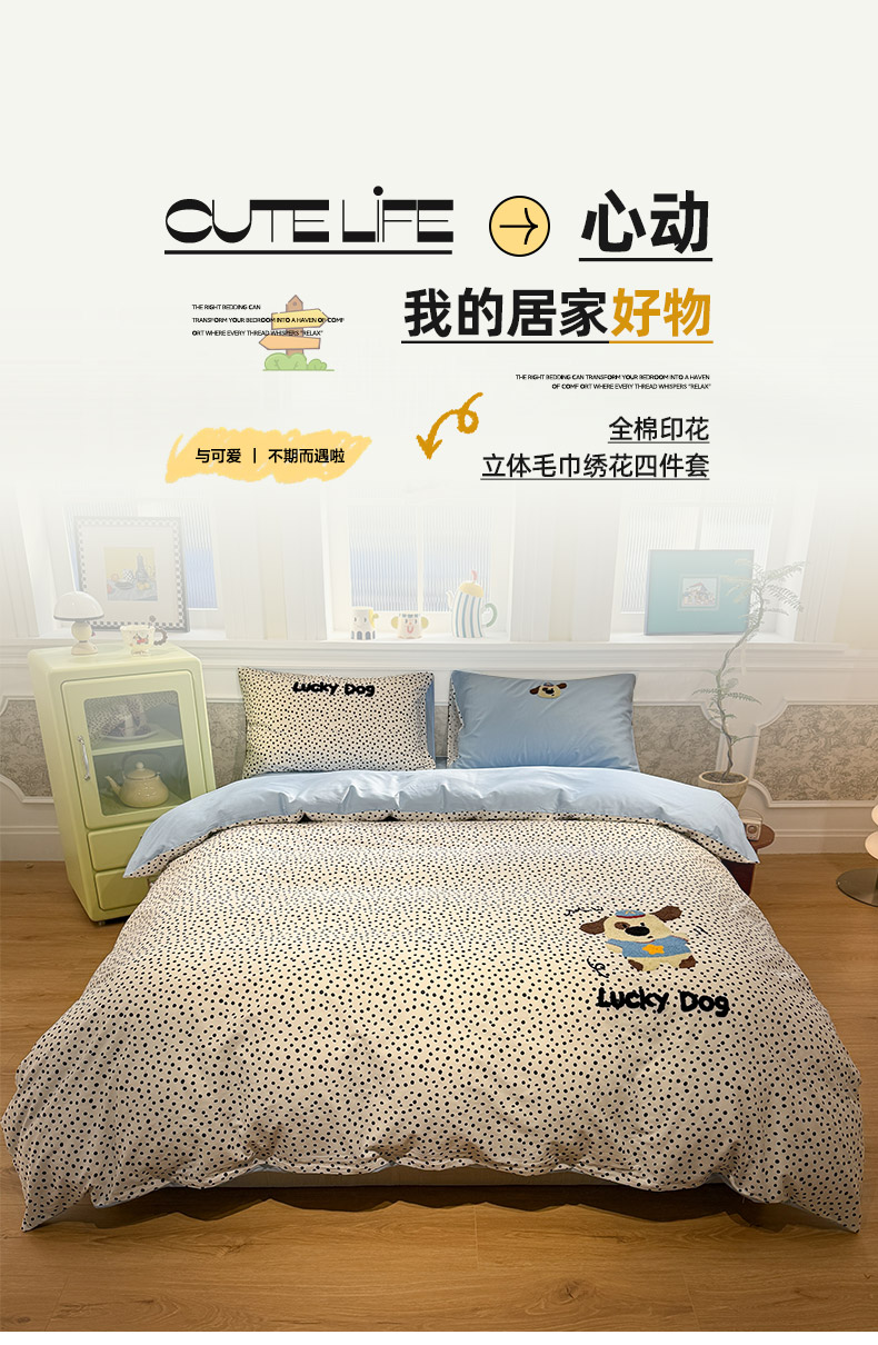 当前位置: 91家纺网 > 商品网购 > 床品套件 > 四件套 > 全棉普通四件套 > 怡家居 2026新款全棉纯棉印花立体毛巾绣四件套 大耳朵狗狗