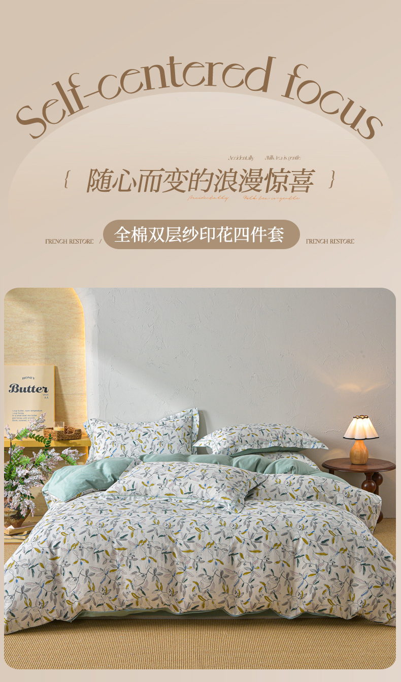 当前位置: 91家纺网 > 商品网购 > 床品套件 > 四件套 > 全棉普通四件套 > 金昱纺 2026新款全棉纯棉双层纱印花四件套 镜花眠-绿