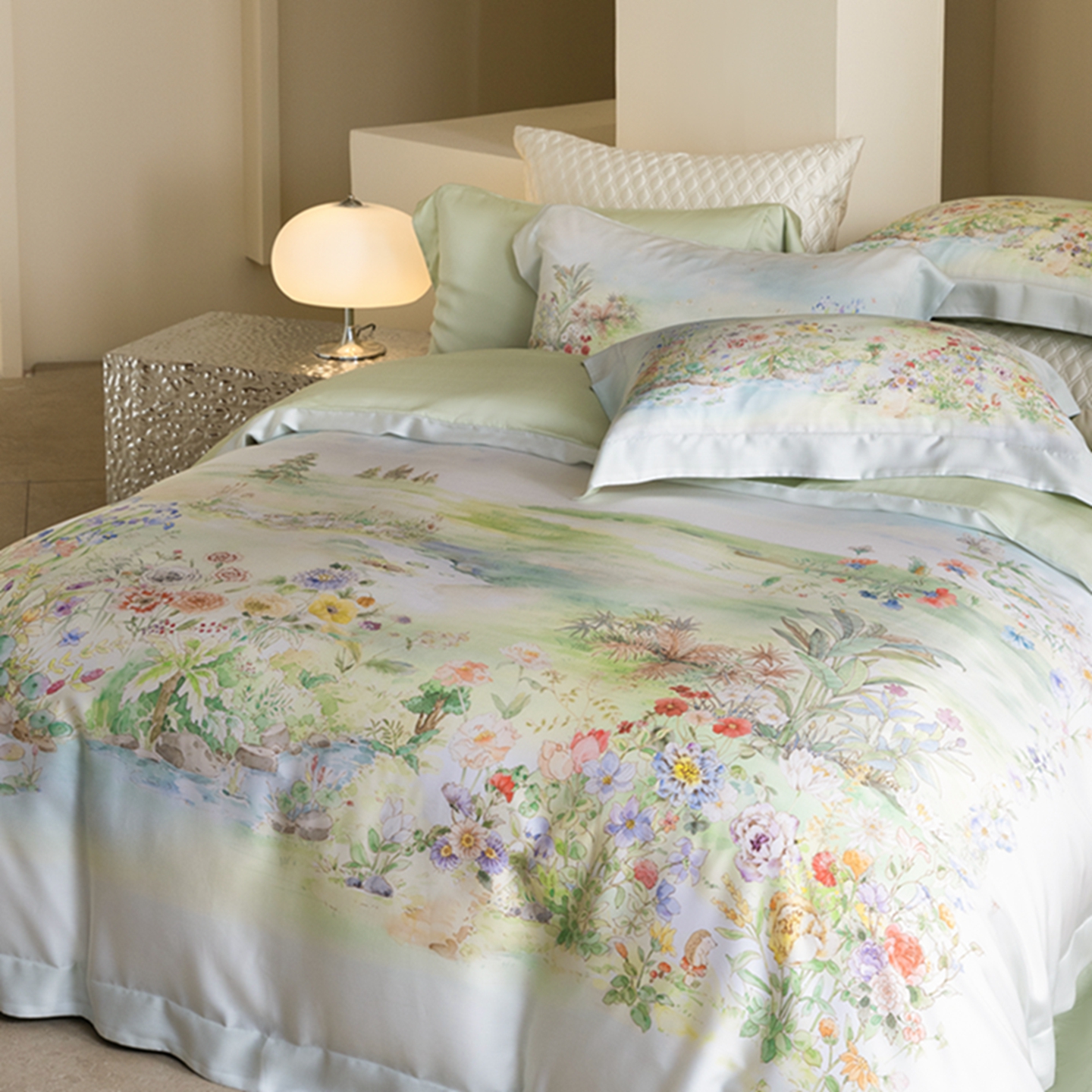 (总)时亿家居 2026新款大版莱赛尔天丝印花四件套,蓝姗园 玉,蓝姗园 粉,苏芸 粉,苏芸 玉,夏怡花园 粉绿,夏怡花园 黄绿