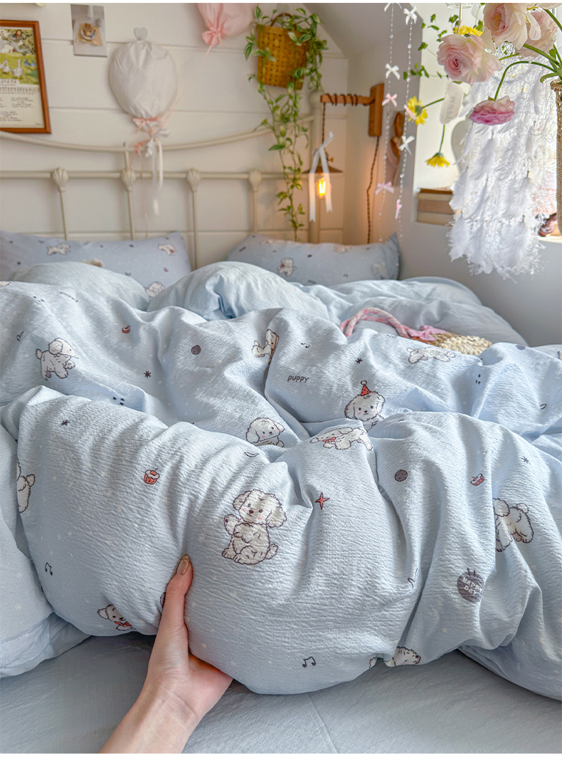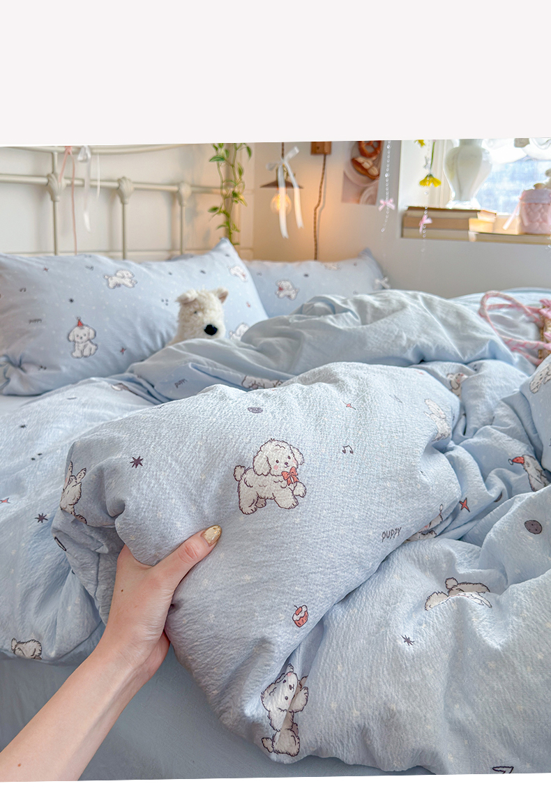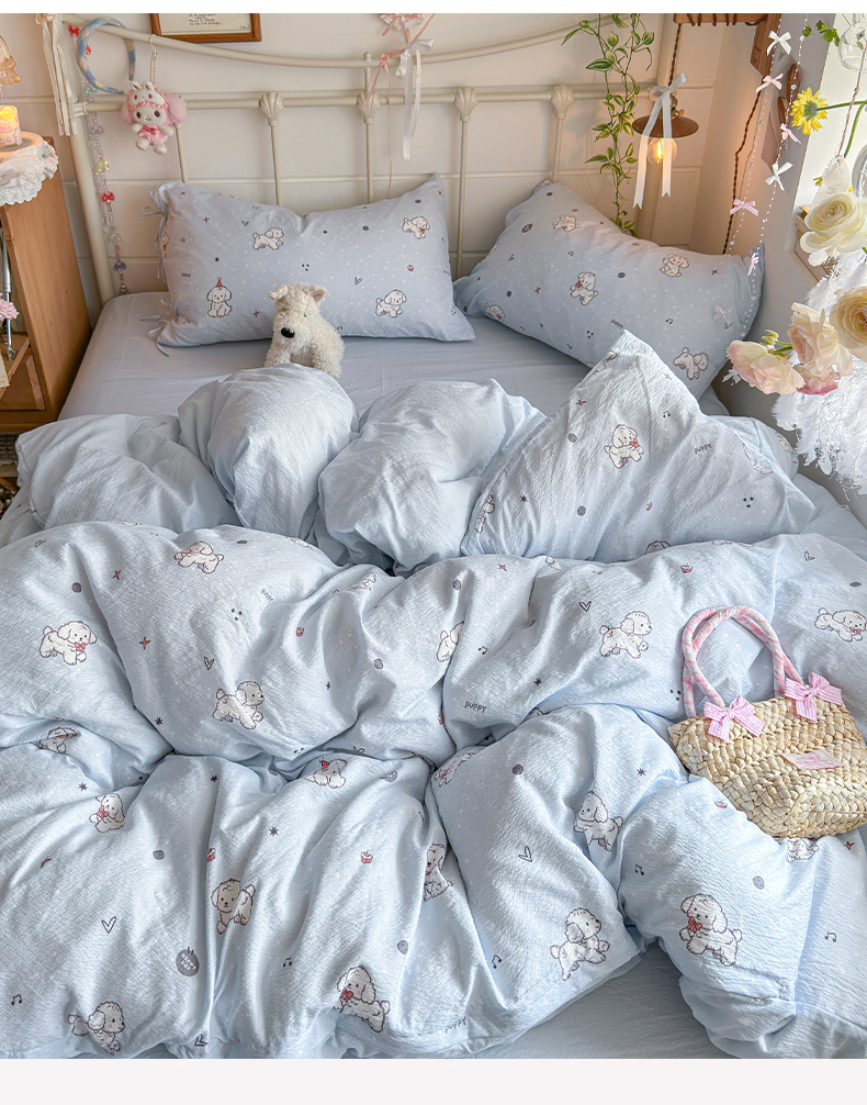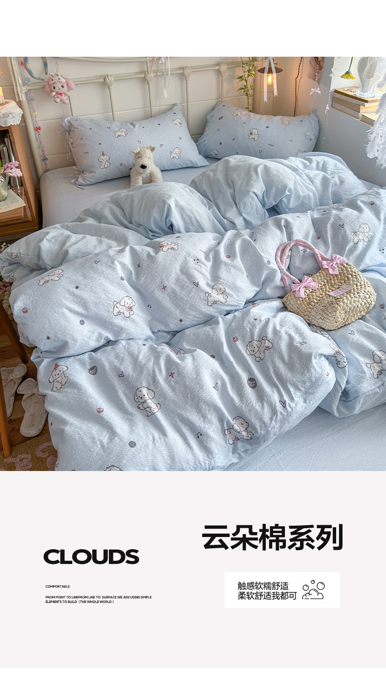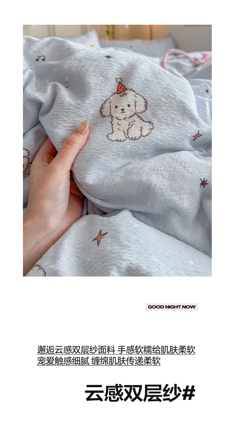 当前位置: 91家纺网 > 商品网购 > 床品套件 > 四件套 > 双层纱四件套 > 优选 2026新款小清新直播热卖款云感双层纱木棉四件套系列(小红书热款推荐) 可爱修狗