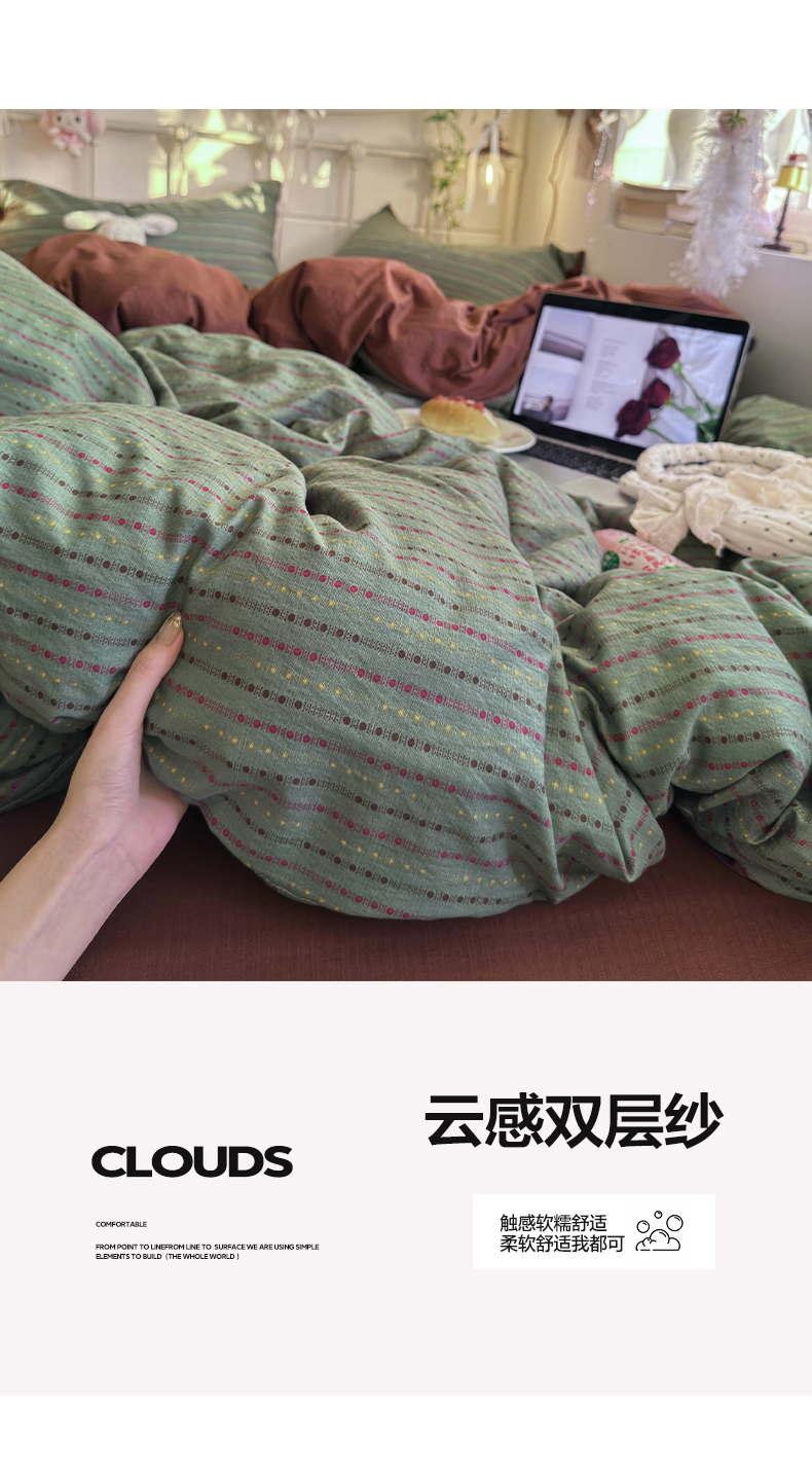 当前位置: 91家纺网 > 商品网购 > 床品套件 > 四件套 > 双层纱四件套 > 优选良品 2026新款小清新直播热卖款云感双层纱木棉床盖四件套系列 费尔岛