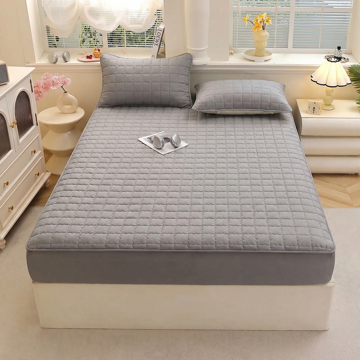 • 91家纺网 家纺一手货源 找家纺 彩亿家纺 2026新款A类古法水洗仿棉夹棉床笠三件套床垫保护套四季通用床罩-波浪格 波浪格-星河灰