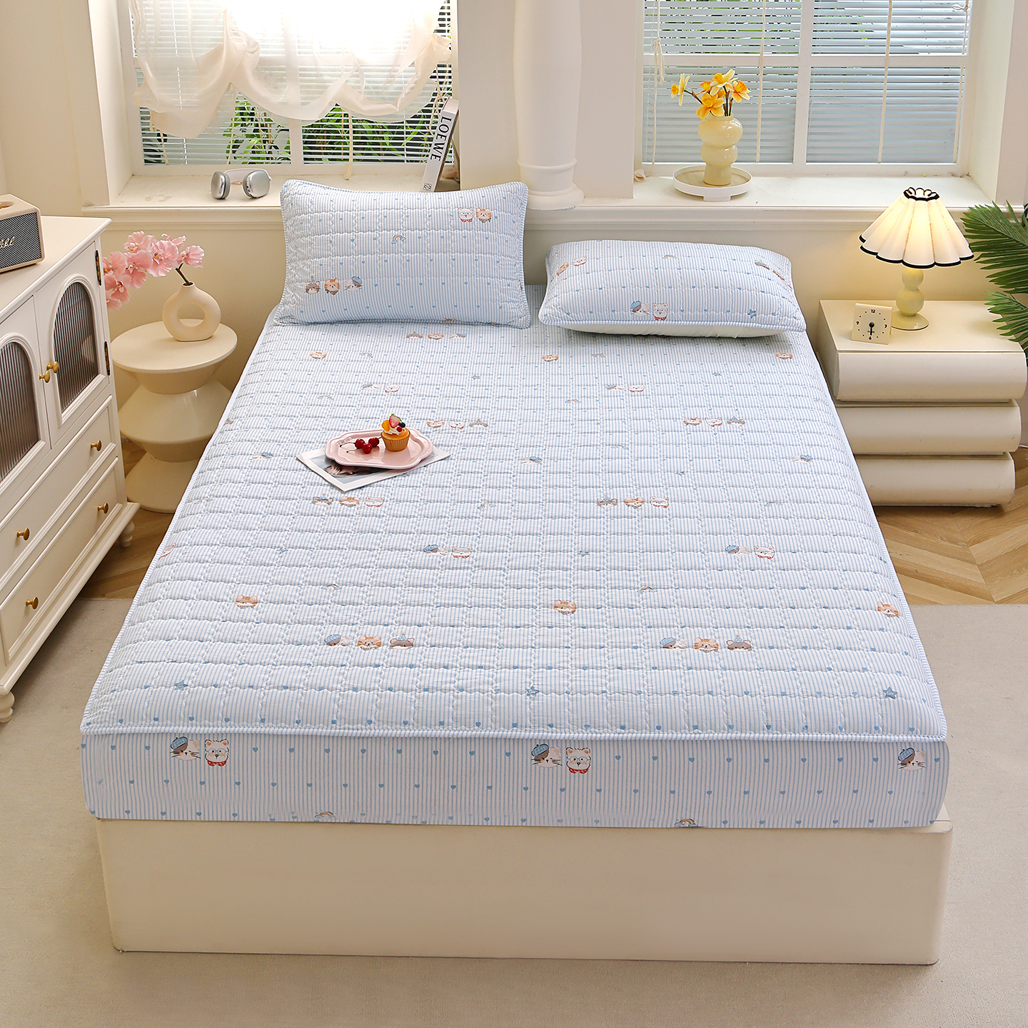 (总)彩亿家纺 2026新款泡芙纱印花款床笠三件套云感泡芙双层纱套件单件床笠,旧街星星,星星糖豆,旋转木马,星星点点,猫猫乐园,萌马驾到,奶蓝蝴蝶,田园兔