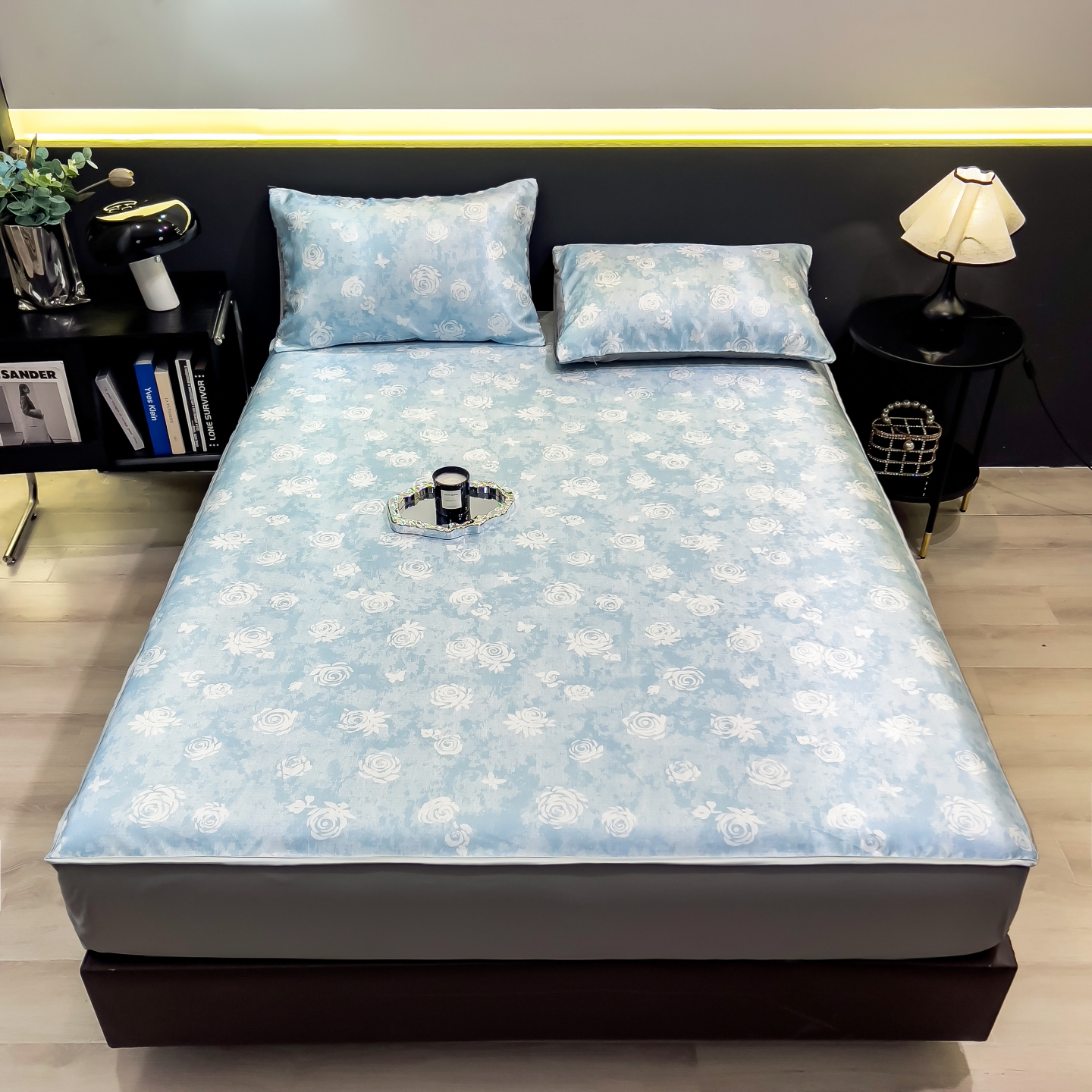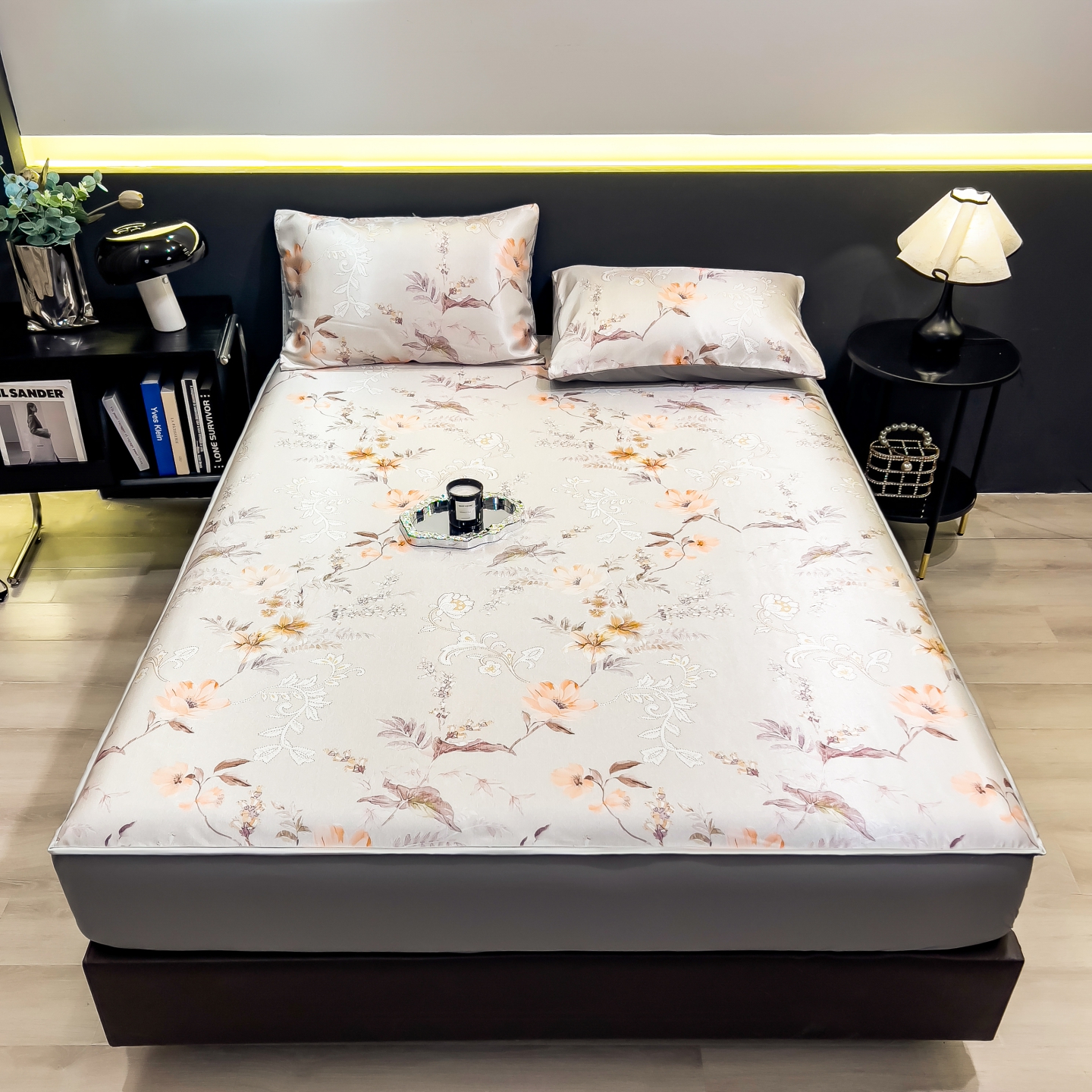 商品名称:梵克保罗 2026春夏新款数码印花大版高克重冰丝凉席床笠款三件套 芸白