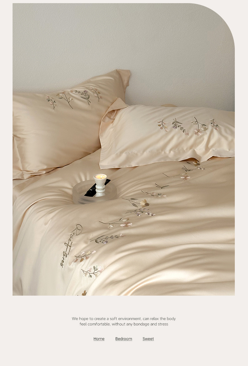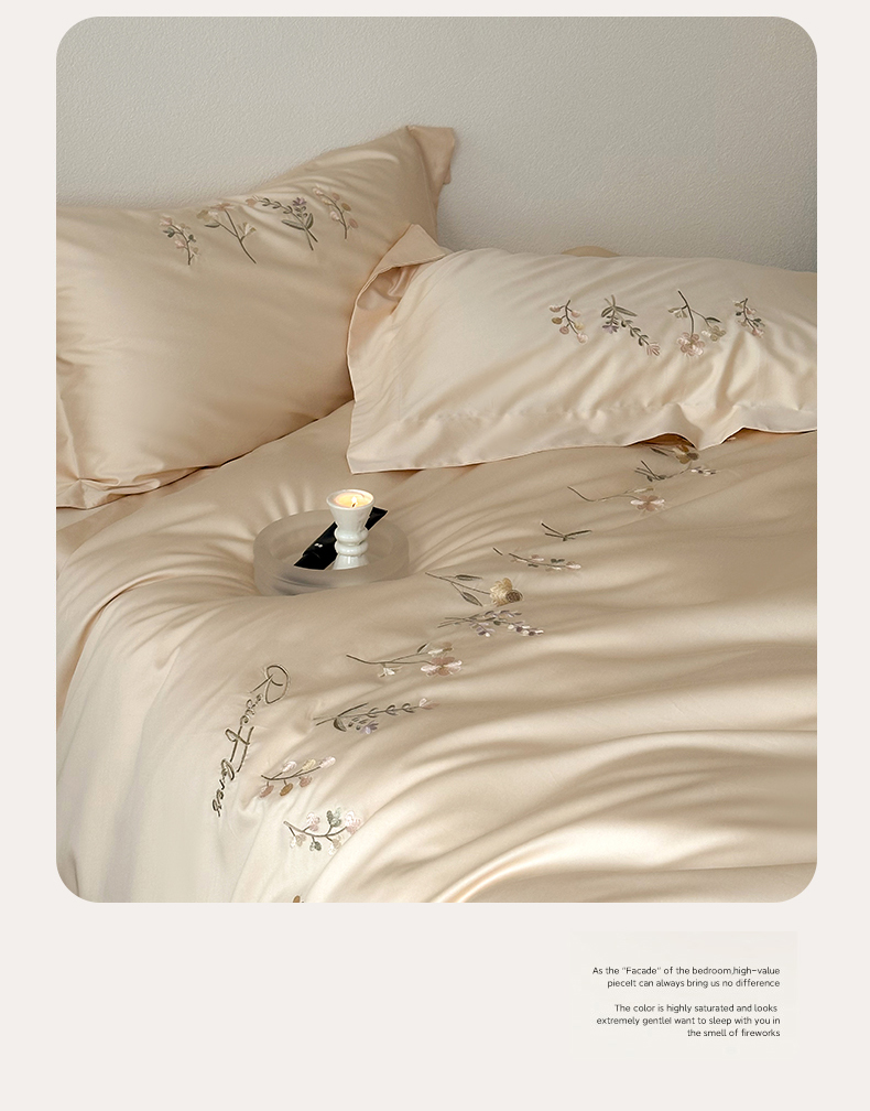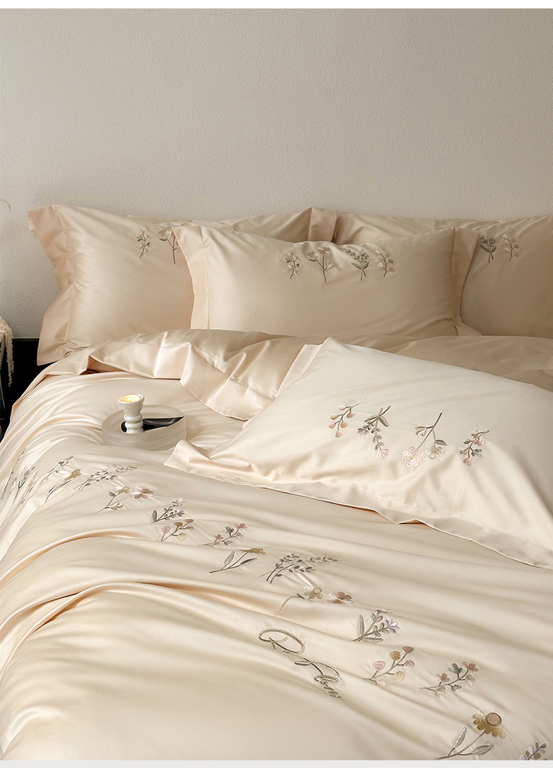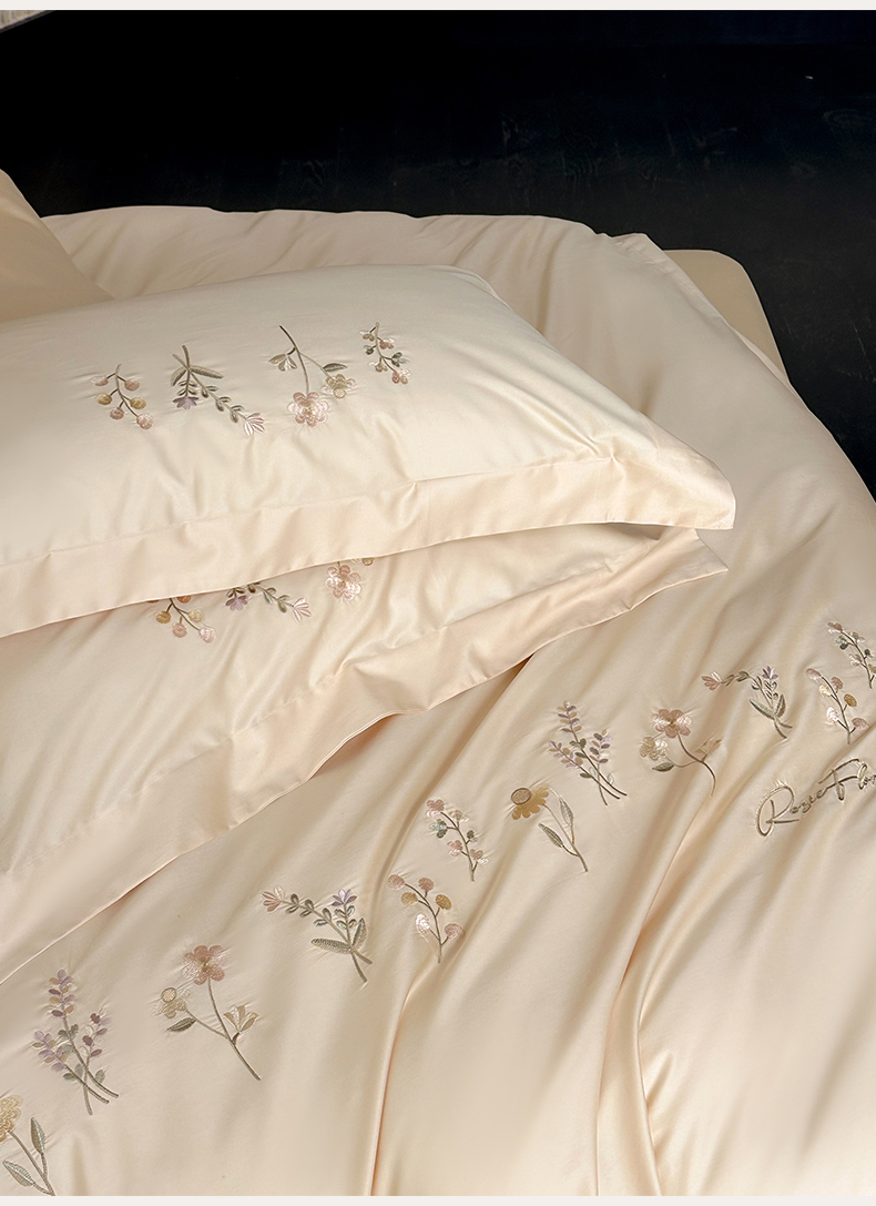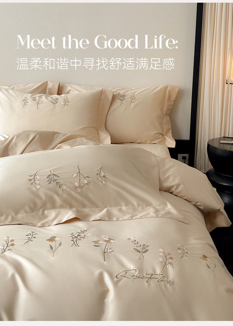商品名称:泽西家纺+V17798841158发大图 2026新品刺绣50s双股全棉长绒棉纯棉宽边四件套-花有约 花有约-浅米驼