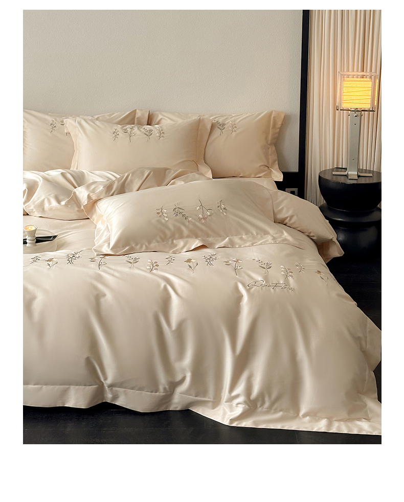 泽西家纺+V17798841158发大图 2026新品刺绣50s双股全棉长绒棉纯棉宽边四件套-花有约 花有约-浅米驼