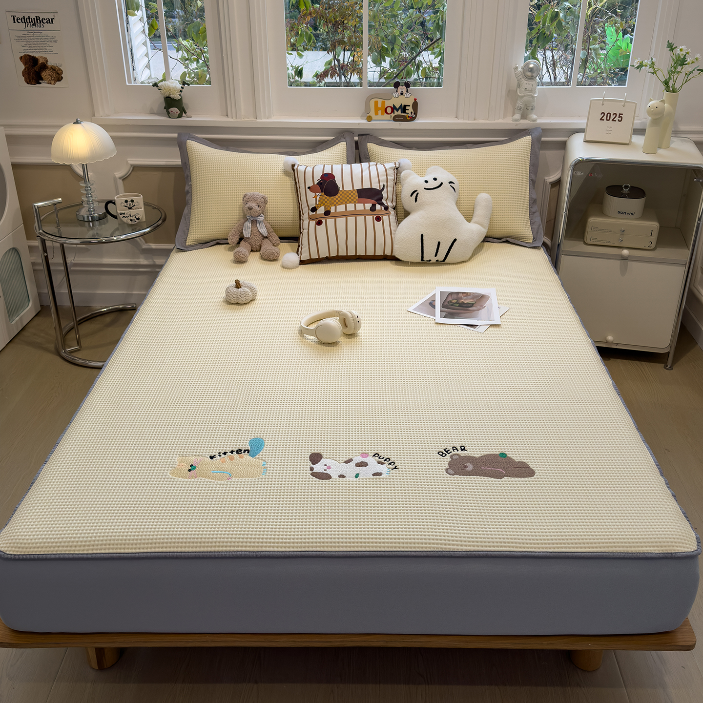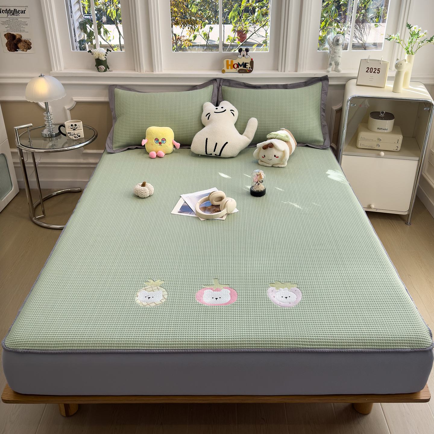 几禾 2026新款华夫格刺绣款凉席-床笠款 奶冻喵-果绿-床笠款