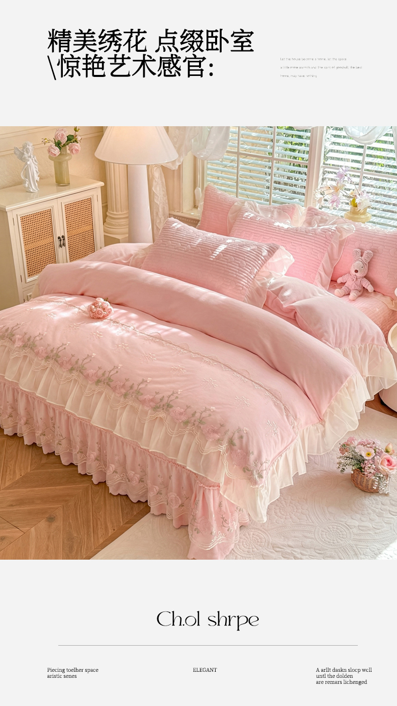 (总)苏米娜家纺SUMINA 2025新款230g高克重韩版立体盘花牛奶蚕丝绒绣花四件套床裙款被套-洛丽塔系列,洛丽塔-嫩黄 ,洛丽塔-香芋紫,洛丽塔-珍珠粉, 洛丽塔-婴儿蓝