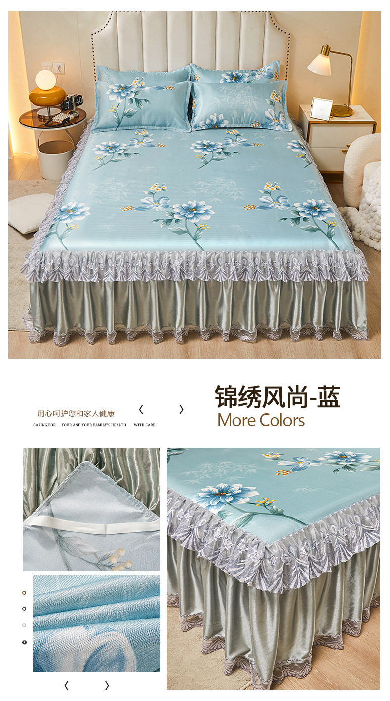 妖妖家纺 2026新款双层蕾丝床裙夏凉冰丝席 烟雨绿