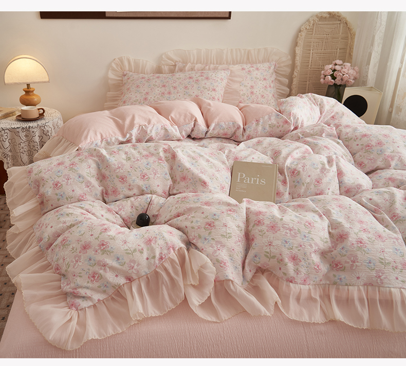 (总)晨曦家纺 2026新款韩系法式慵懒氛围感印花泡芙花边四件套,红莓花信,布朗花影,可可花舞,森系精灵,雾灰庄园