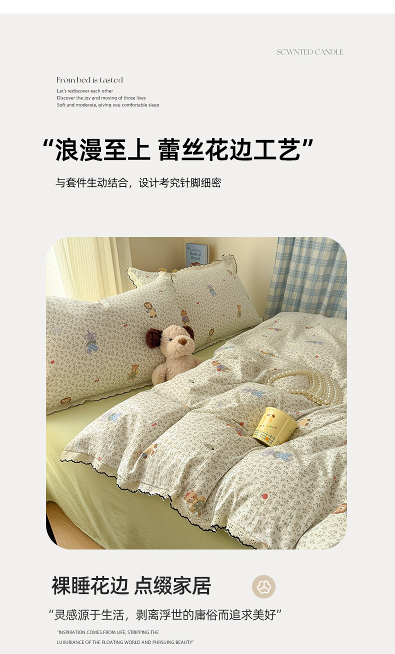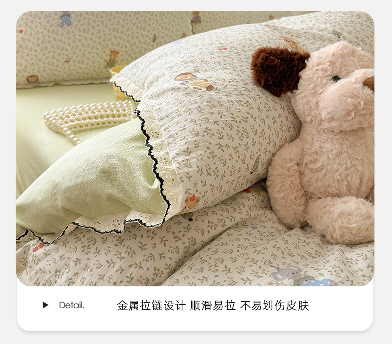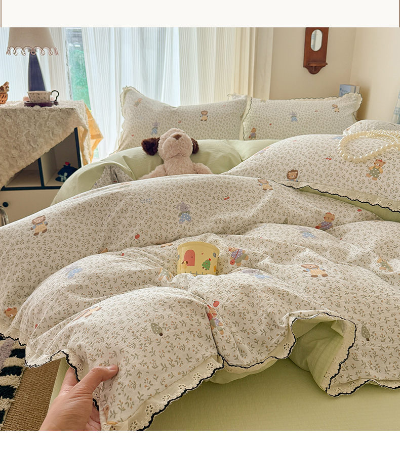 商品名称:温眠家纺 2026新款针织提花双层纱全棉蕾丝花边四件套 软萌可可