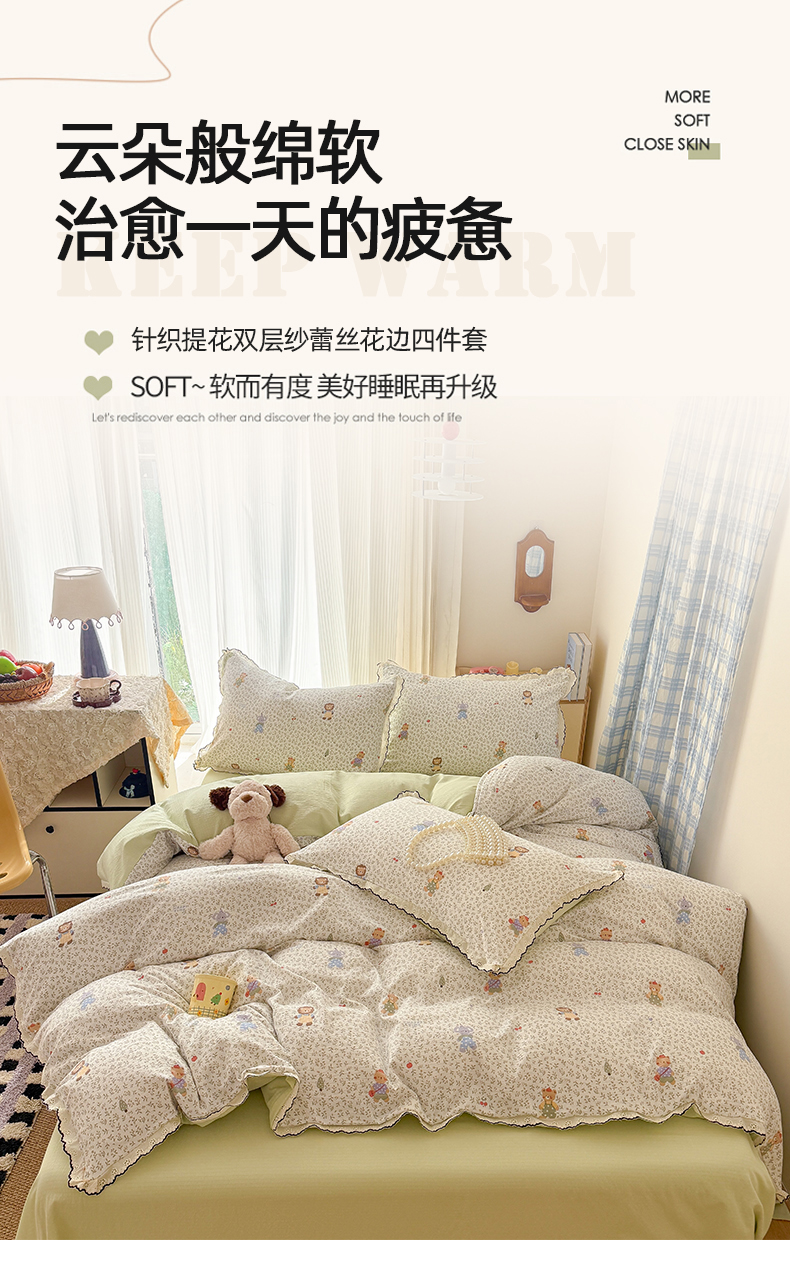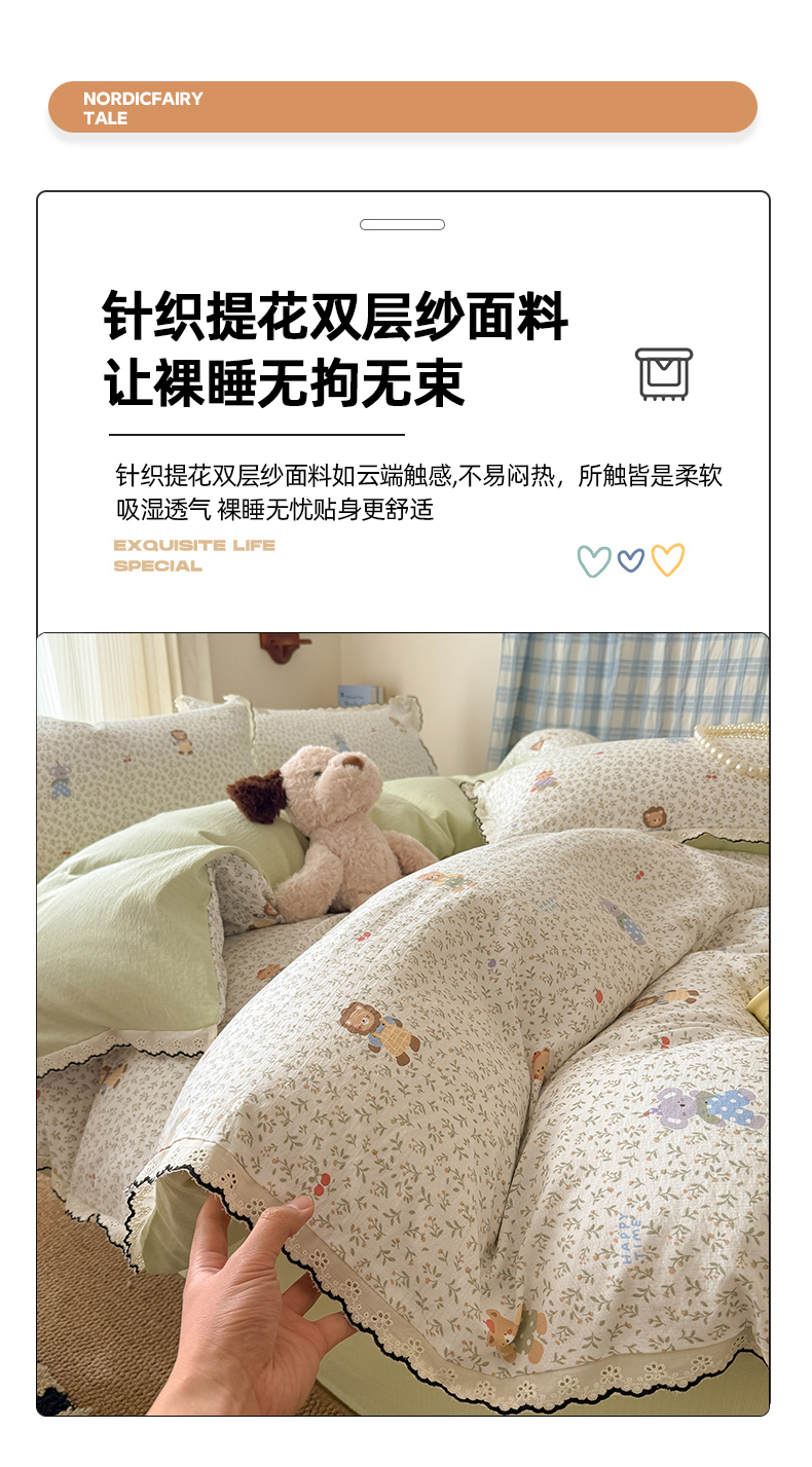 (总)温眠家纺 2026新款云感针织提花双层纱四件套,小木马,百变叮当,彩虹小马,草木诗,春漾,动物园,恐龙世界,快乐小兔,快乐小新,快乐星星,兰亭,梨花落,猫咪乐园,奶油风,柠夏,派对狗,青苹果,晴天小猫,甜心萝莉,未来暮,小海绵,星雪人,樱桃酱,紫薰