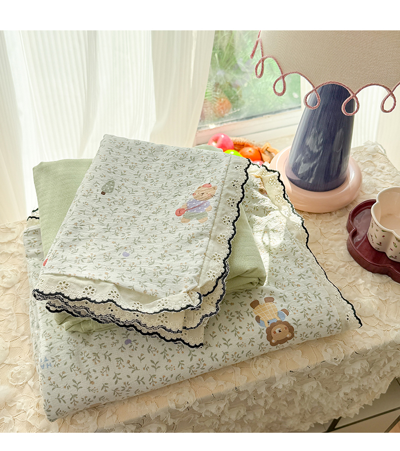 (总)温眠家纺 2026新款针织提花双层纱全棉蕾丝花边四件套,繁花,花田紫,蓝萱,墨蓝,奶油芝士,苹果星人,秋之恋,软萌可可,藤蔓,甜心猫咪,甜心木马,乌梅子酱,夏之物语,薰衣草,阳光花絮,枝芽