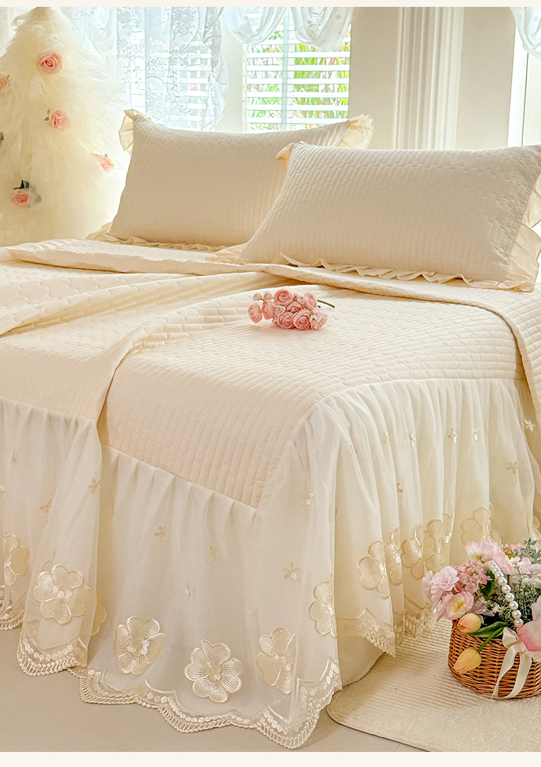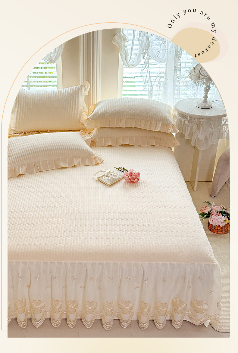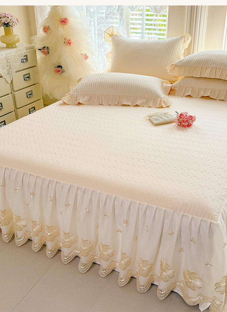 • 91家纺网 家纺一手货源 找家纺 花香四季家纺 2026新款全棉夹棉绗缝床裙三件套纯棉纯色蕾丝公主风床裙单件-蕾丝小姐 蕾丝小姐-奶油米