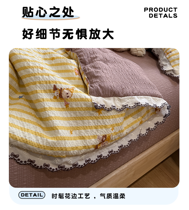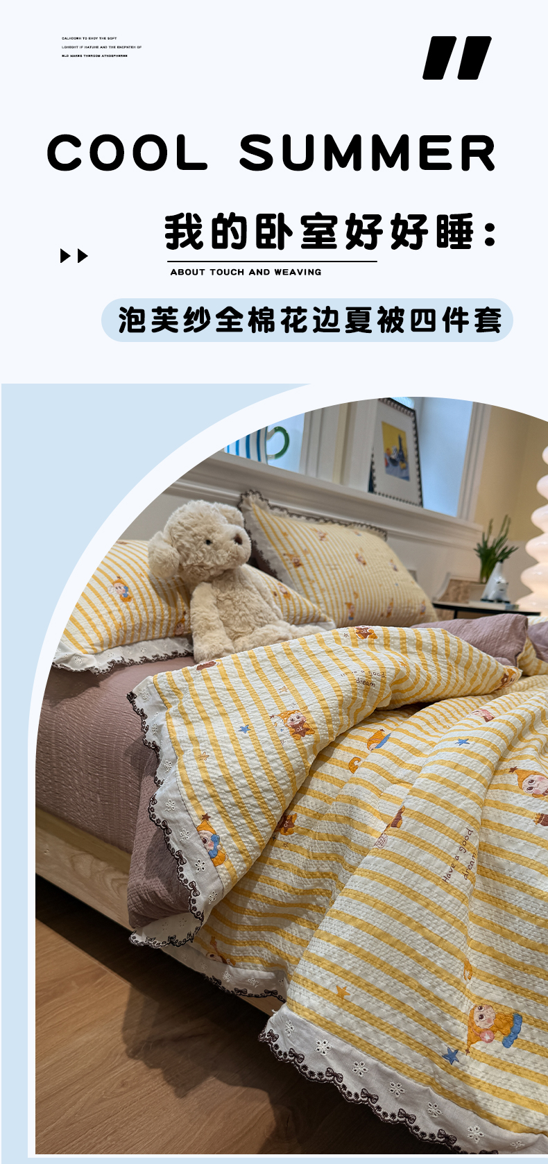 商品名称:水墨江南 2026新款泡芙纱全棉花边夏被四件套 花边夏被-条纹星仔