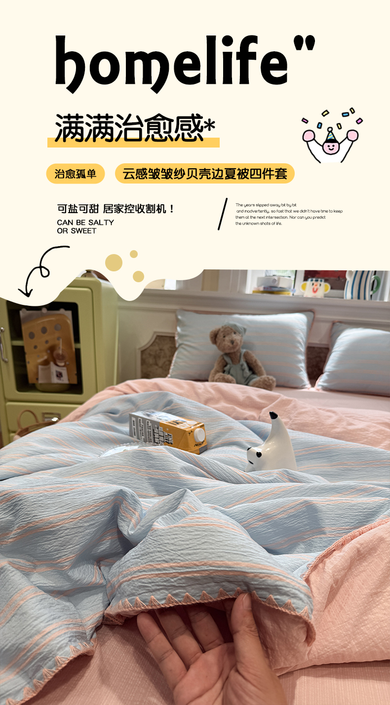 (总)水墨江南 2026新款泡芙纱花边夏被四件套,波点蝴蝶,蛋糕星仔,动感小狗,粉色小兔,红果果,可爱熊,快乐云朵,浪漫粉黛,猫猫聚会,奶酪星仔,幸运小狗,紫色小兔,hello星仔,组合图仅供参考
