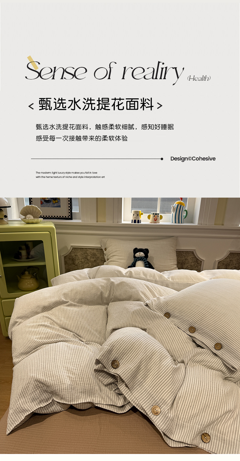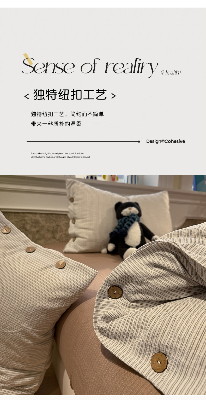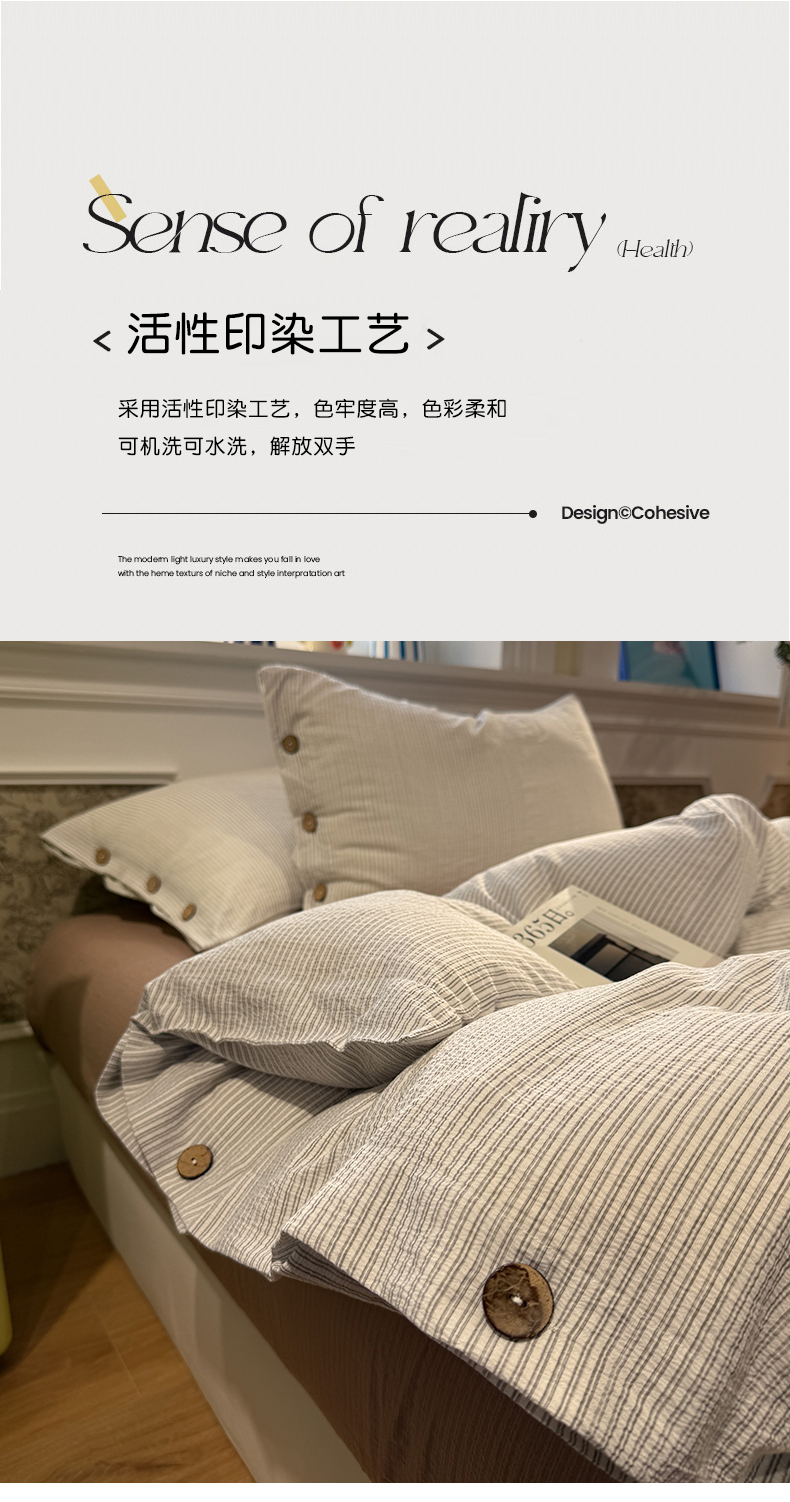 当前位置: 91家纺网 > 商品网购 > 床品套件 > 四件套 > 化纤普通四件套 > 水墨江南 2026新款无印风水洗提花纽扣款四件套 月光灰条