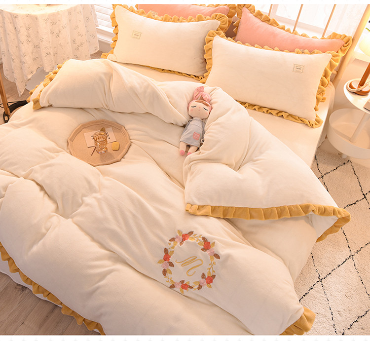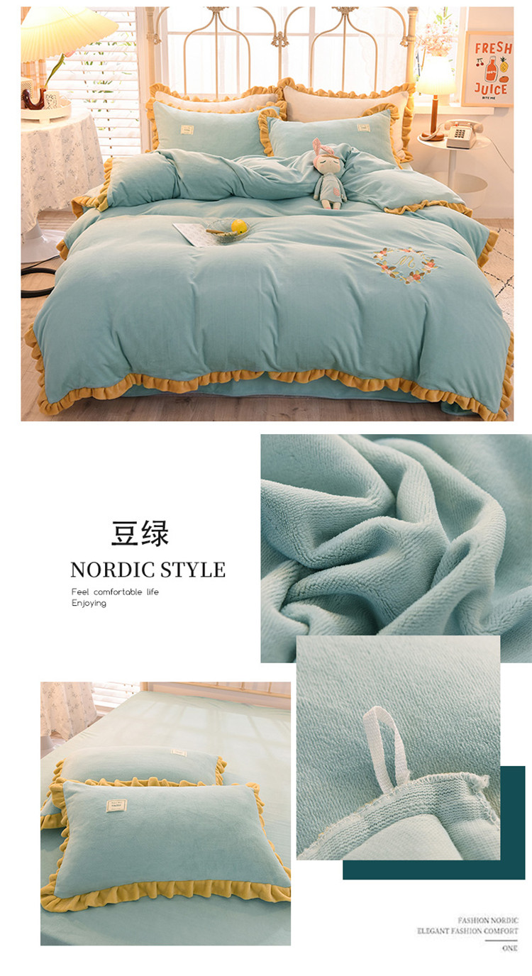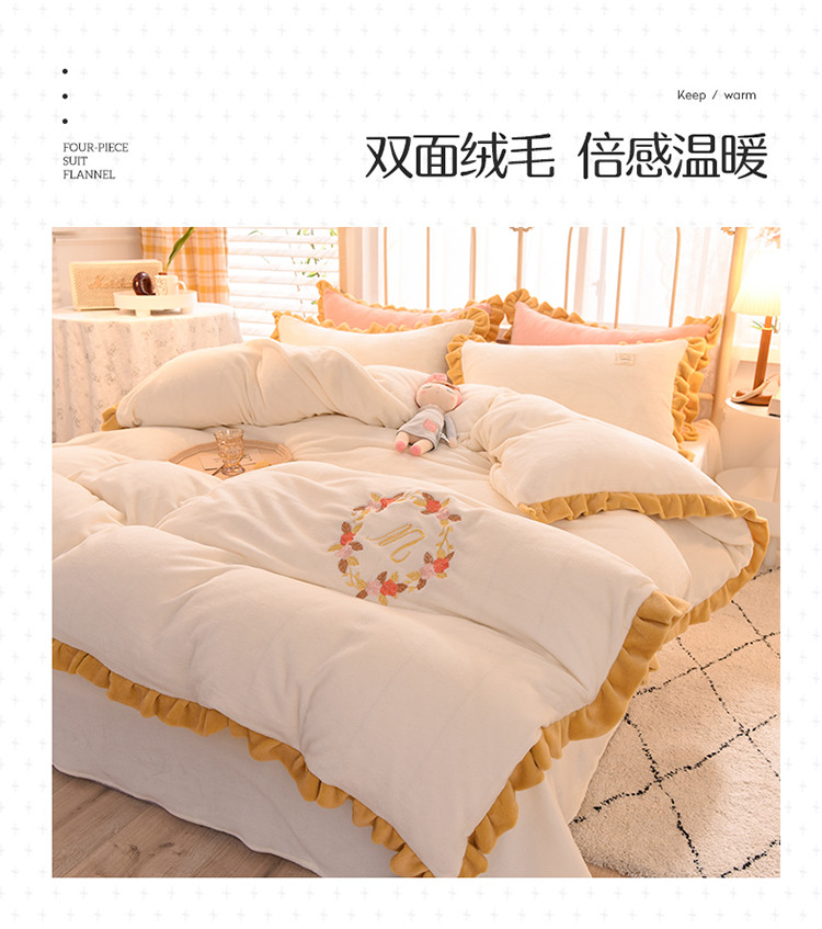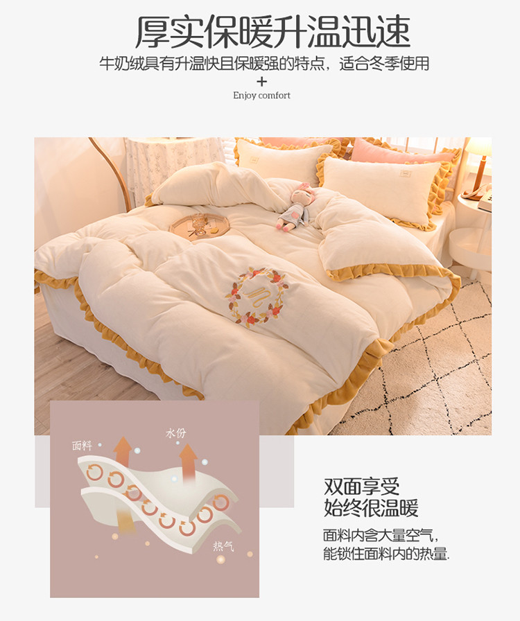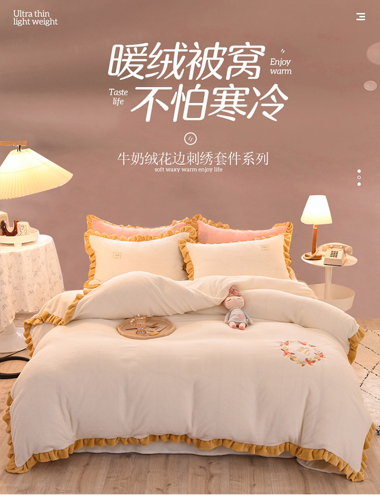 (总)艾米家居 2025秋冬新款浮雕牛奶绒花边四件套,白色,豆沙,粉色